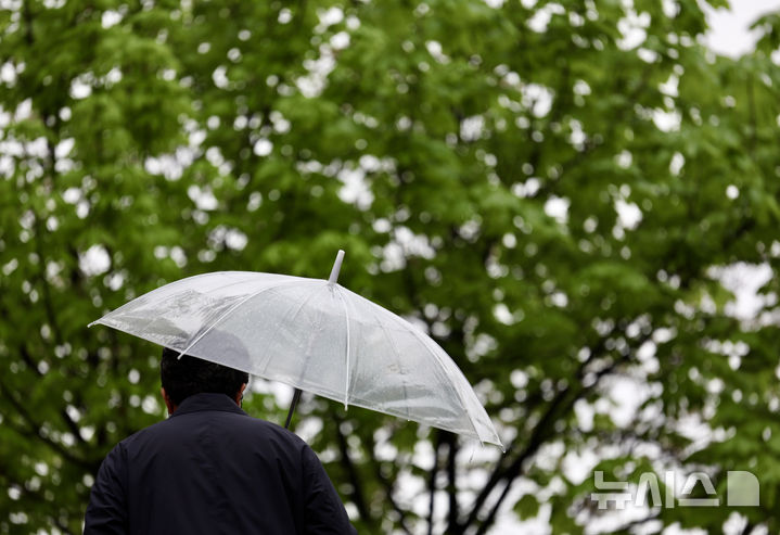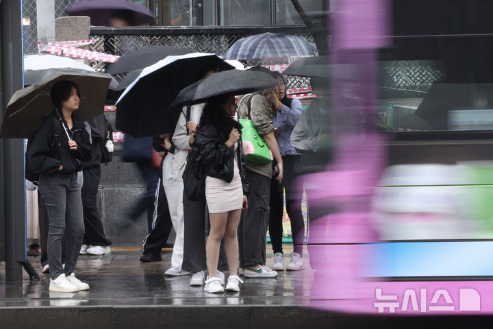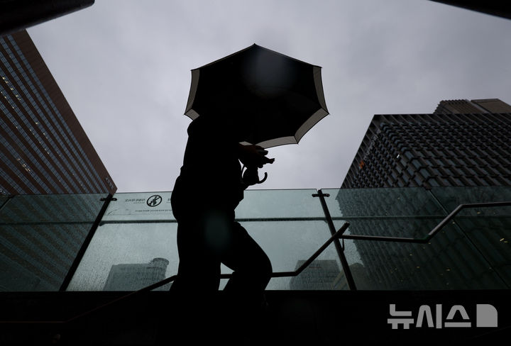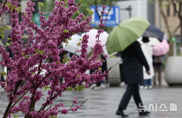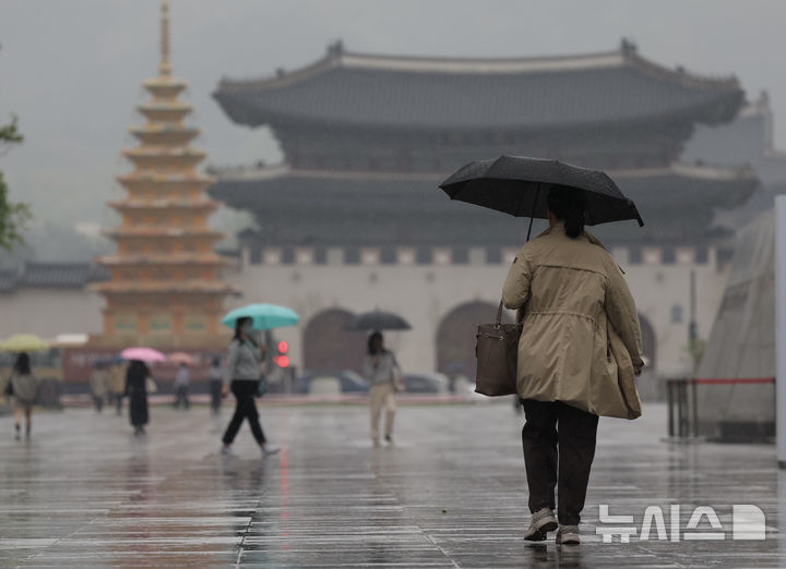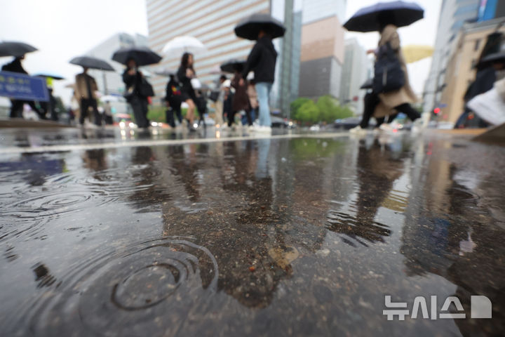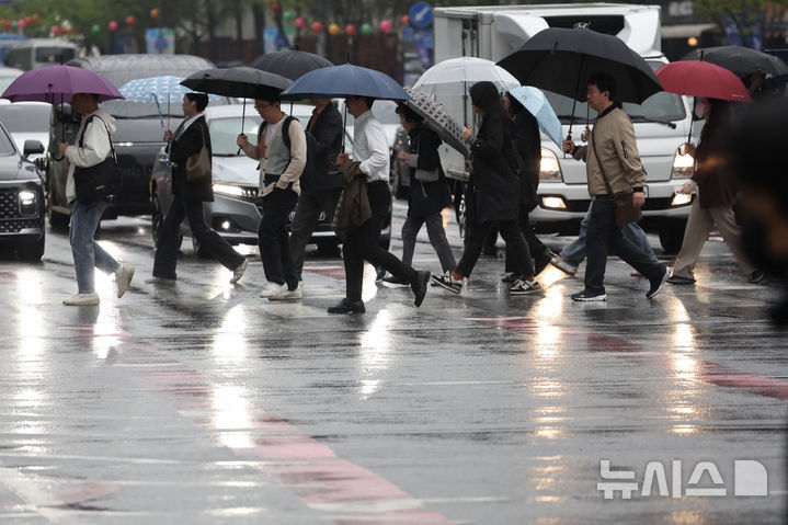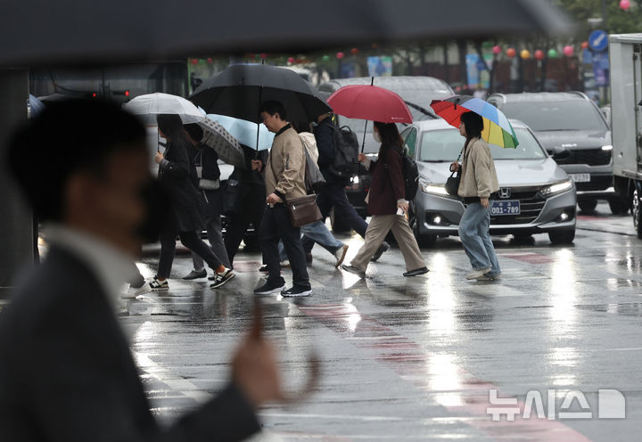 【NEWSIS】雨が降った22日午前、ソウル市鍾路区の世宗大路交差点で、傘をさして急ぎ足で歩く人々。
