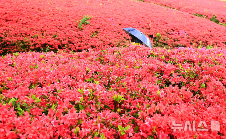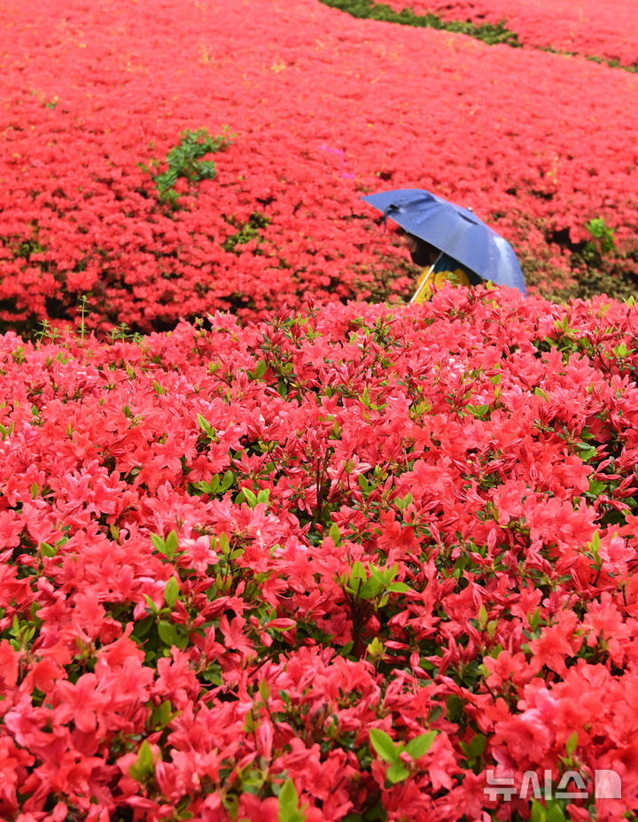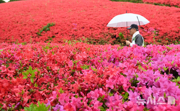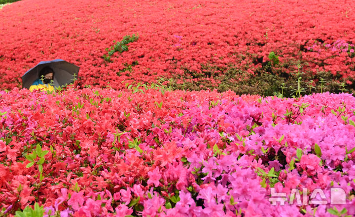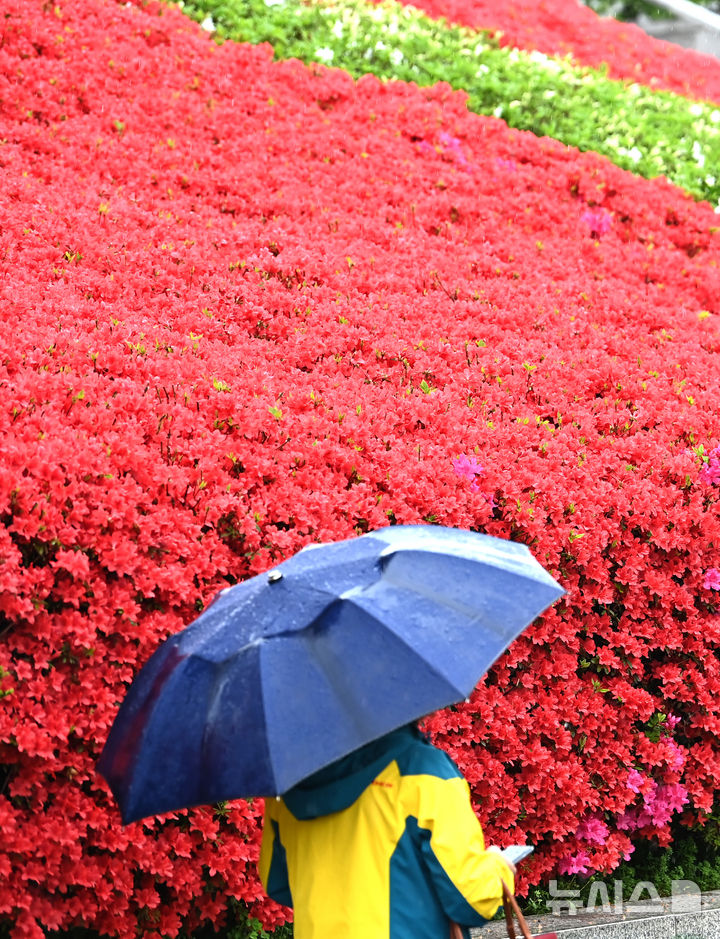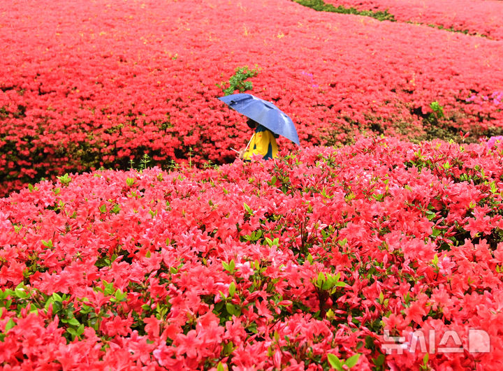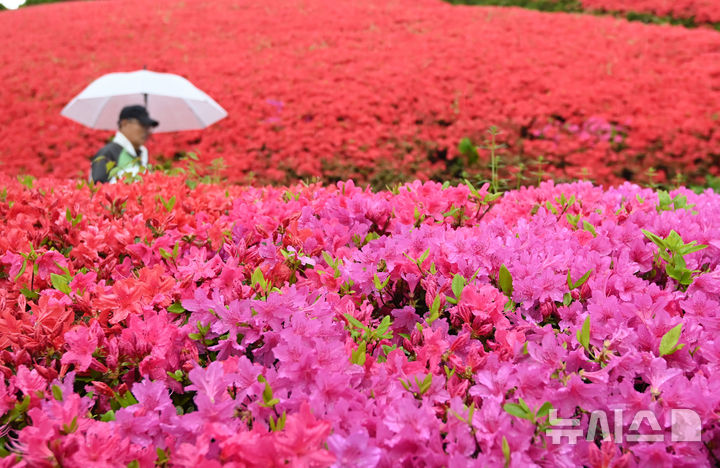 【NEWSIS】春雨が降った22日、京畿道水原市八達区の牛満洞で、雨傘を差した市民が大きく開花したツツジの間を歩いている様子。