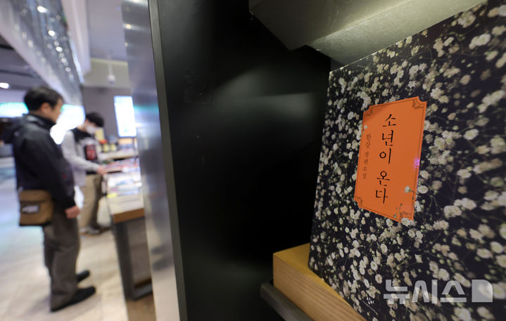 【NEWSIS】作家韓江(ハン・ガン)の小説『少年が来る』が、最近10年間で最も多く売れた本だという集計結果が出た。写真は23日、ソウル市鍾路区光化門の大手書店「教保文庫」に並ぶ『少年が来る』。