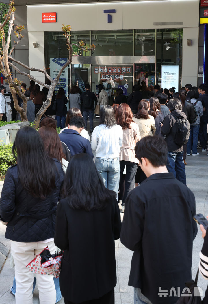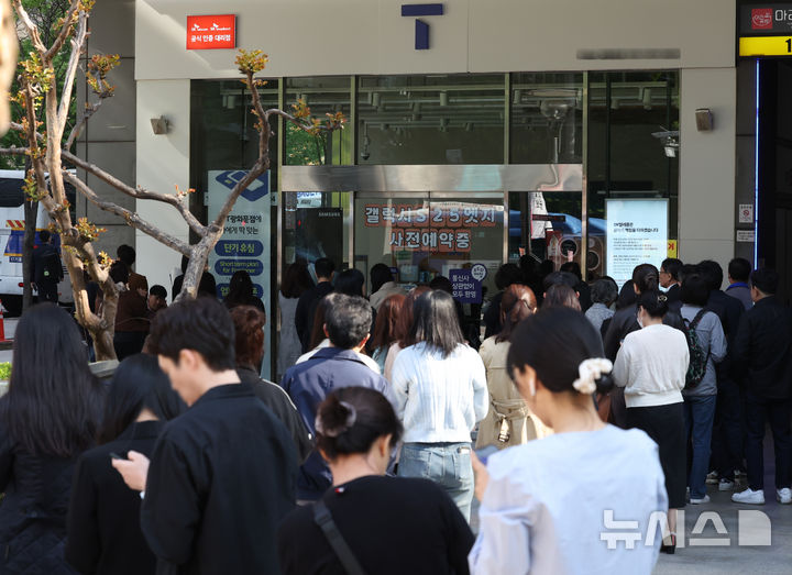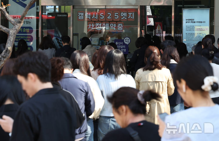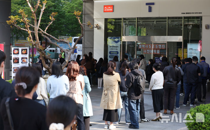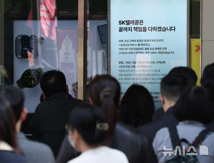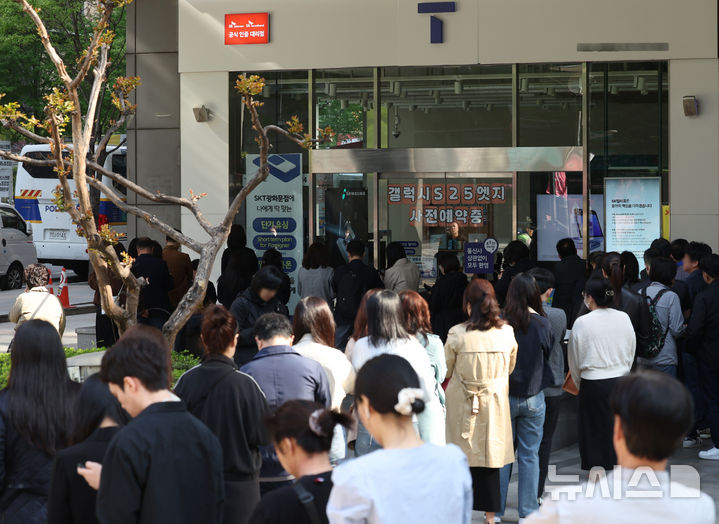 【NEWSIS】28日午前、ソウル市内のあるSKテレコム代理店前で、USIM(ユーシム=携帯電話に差し込む、契約者情報を記したICカード)交換のため営業時間前から行列するSKテレコム利用者たち。ハッキング事故が発生した韓国最大の通信事業者SKテレコムでは、サイバー侵害被害を防ぐため、28日午前10時から全国約2600カ所の代理店で希望する利用者を対象にUSIMの交換を無料で行うことにした。