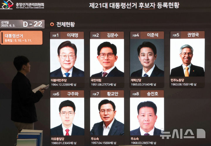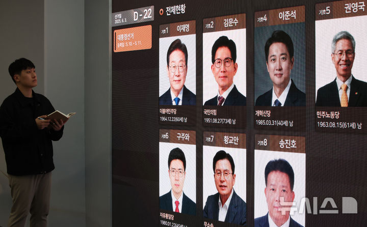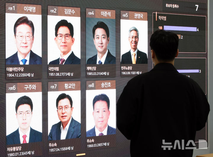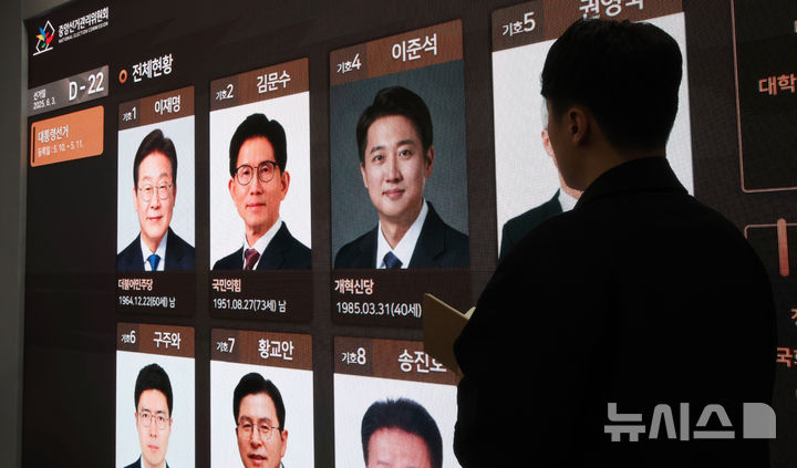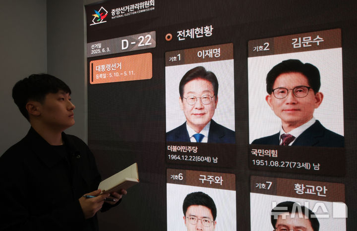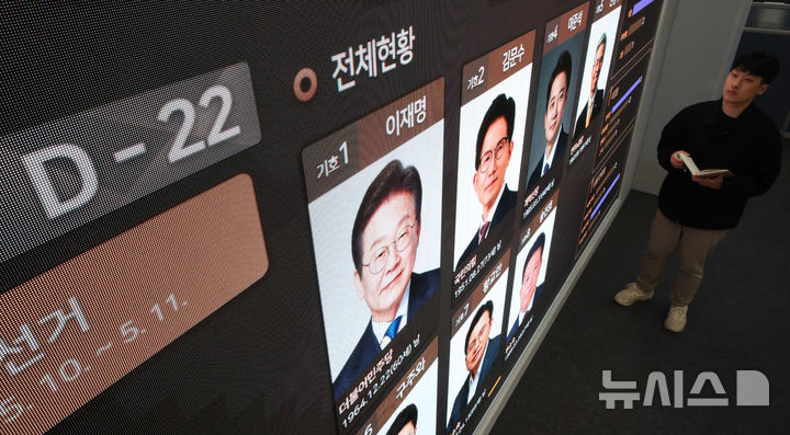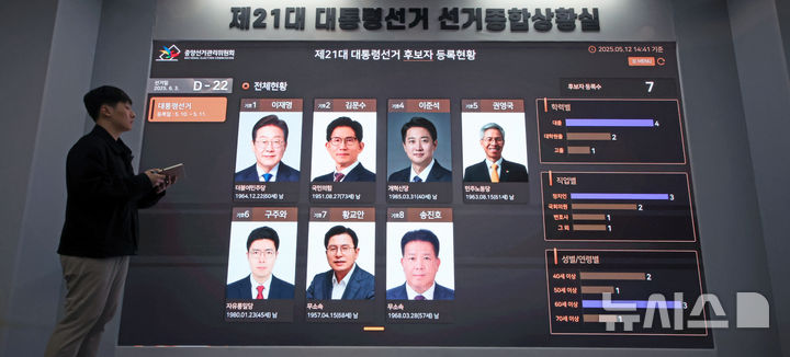【NEWSIS】第21代韓国大統領選挙の公式選挙運動が始まった12日、京畿道果川市の中央選挙管理委員会選挙総合状況室に、候補登録現況が表示されている様子。