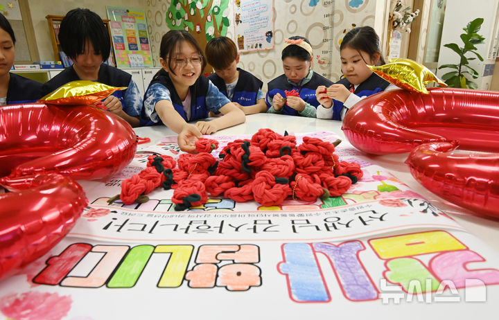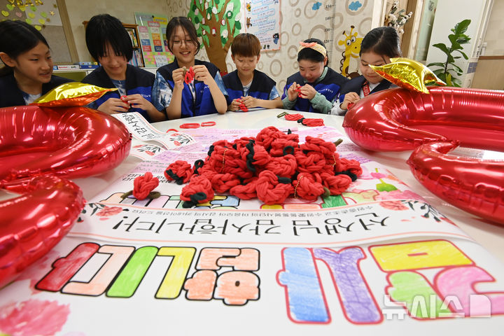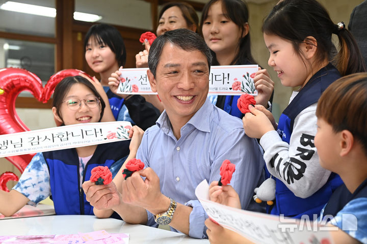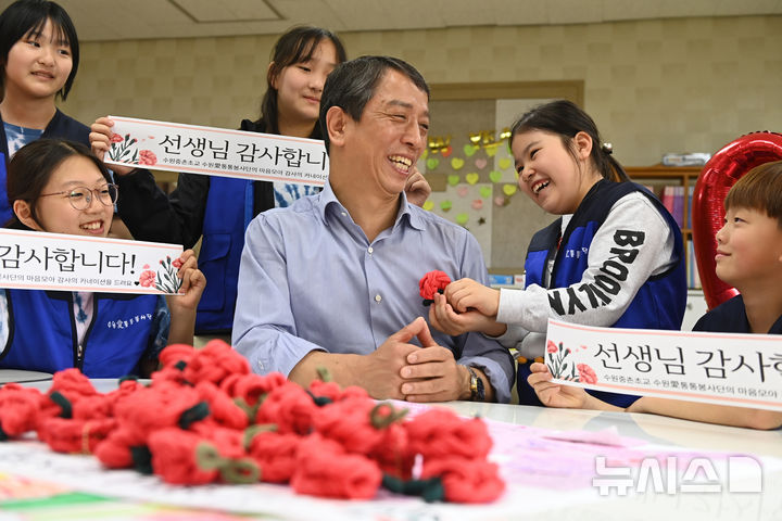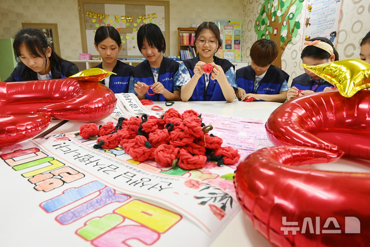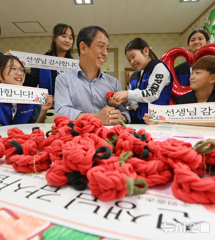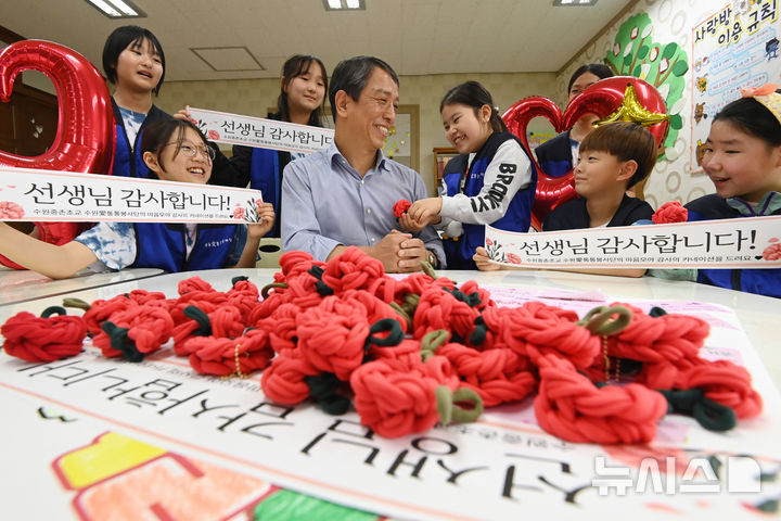 【NEWSIS】「先生の日」があすに迫った14日、京畿道水原市勧善区の中村小学校で、先生に贈るカーネーションを作っている「トントン奉仕団」の児童。