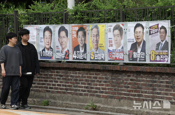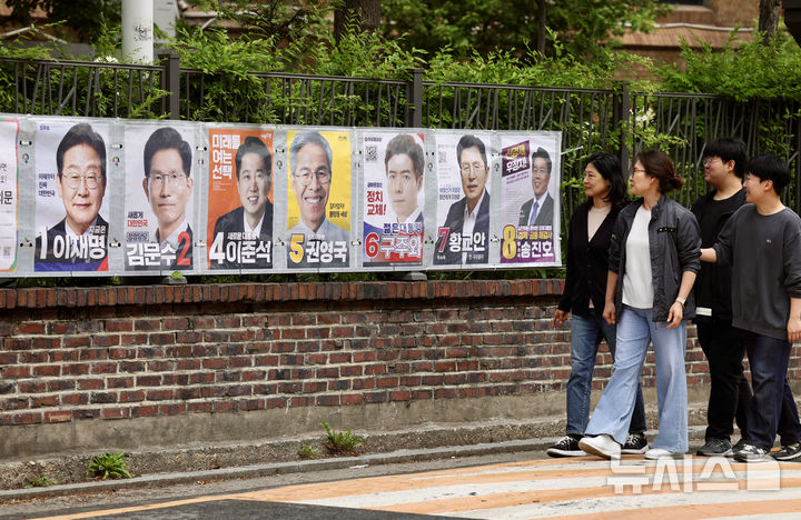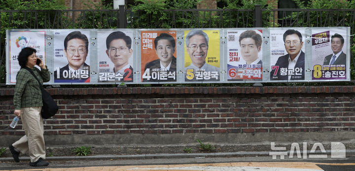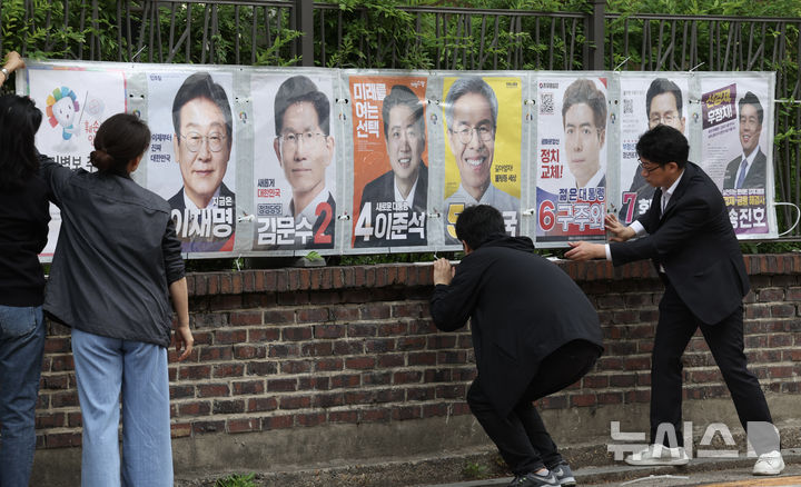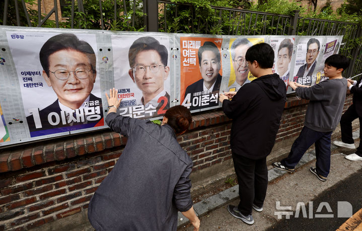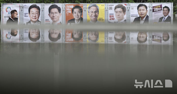 【NEWSIS】15日午前、「芸術家の家」(ソウル市鍾路区)の塀に、第21代韓国大統領選挙の選挙壁報(選挙ポスター)が張ってある様子。選挙壁報は15日から韓国各地のおよそ8万2900カ所に張り出される。