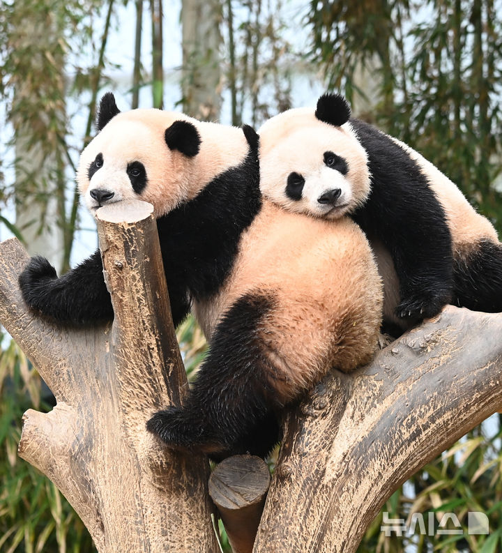 【NEWSIS】「国際生物多様性の日」に当たる22日、エバーランドのパンダワールド(京畿道竜仁市)にある屋内飼育場で、韓国初の双子パンダ「ルイバオ(睿宝)」と「フイバオ(輝宝)」が木登りをして楽しいひとときを過ごしている様子。
