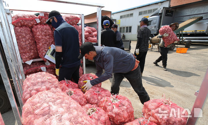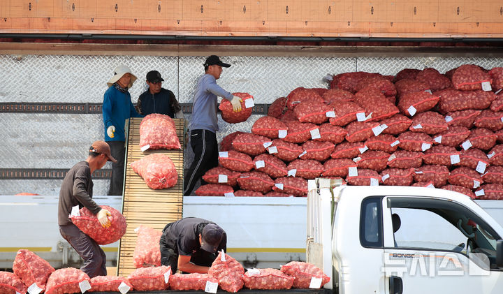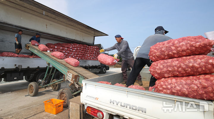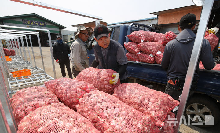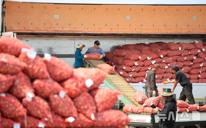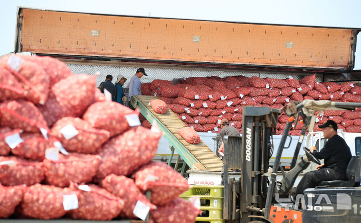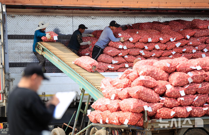 【NEWSIS】26日午前、済州島西帰浦市の大静流通センターで、今年初のニンニクの買い上げが行われている様子。