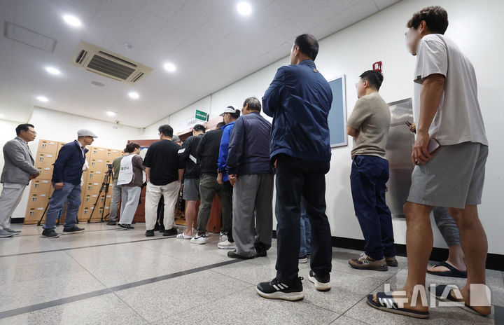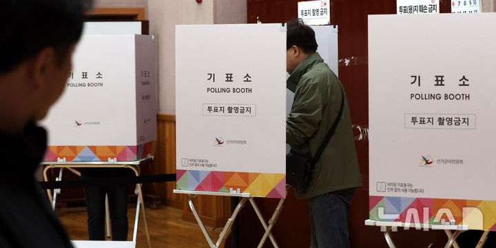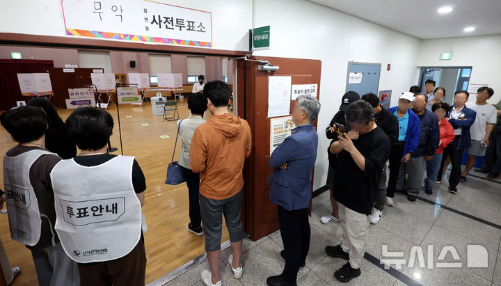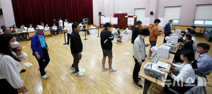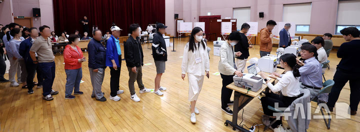 【NEWSIS】第21代韓国大統領選挙の期日前投票初日だった29日午前、ソウル市鍾路区の母岳洞住民センターに設けられた期日前投票所では、大勢の有権者たちが長い列を作っていた。