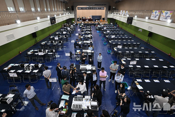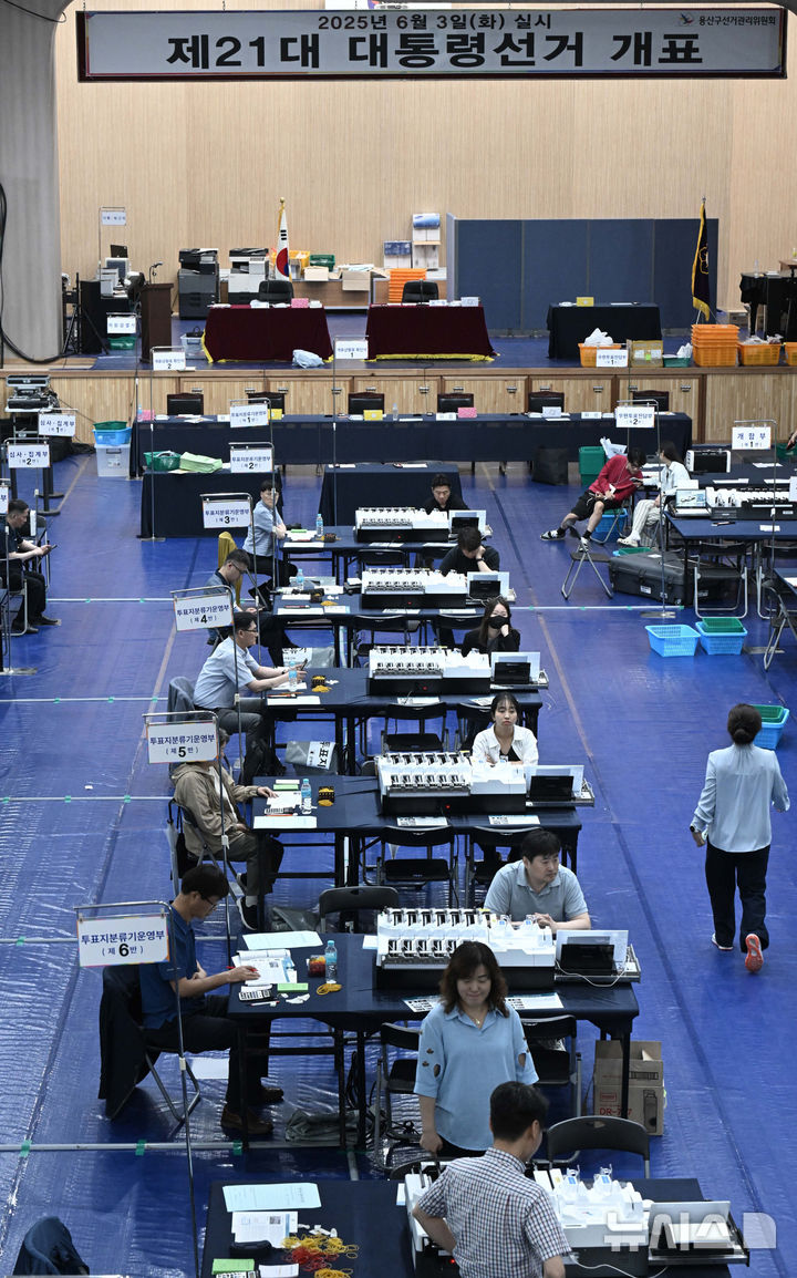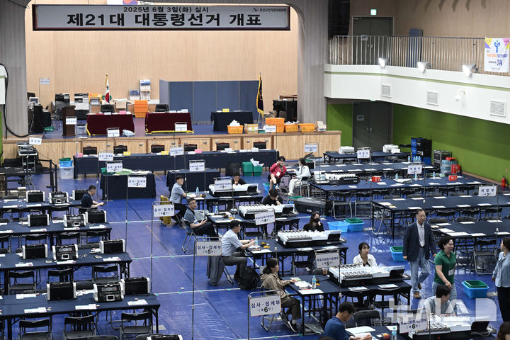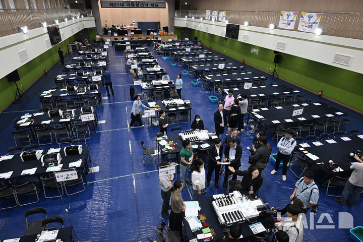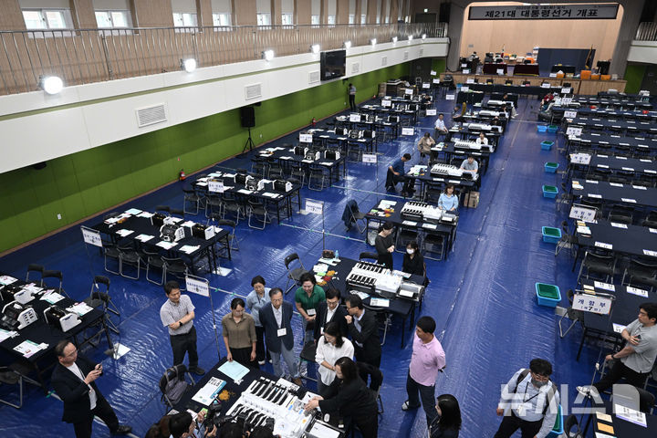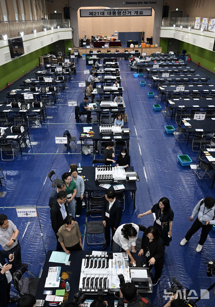 【NEWSIS】第21代韓国大統領選挙があすに迫った2日、ソウル市竜山区の信光女子高に開設された開票所で、竜山区選挙管理委員会の関係者が投票紙分類機の最終模擬試験を行っているところ。