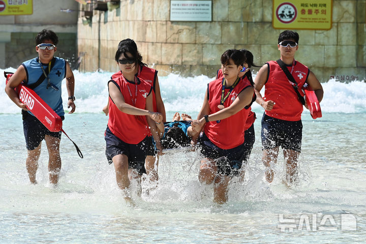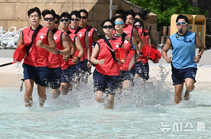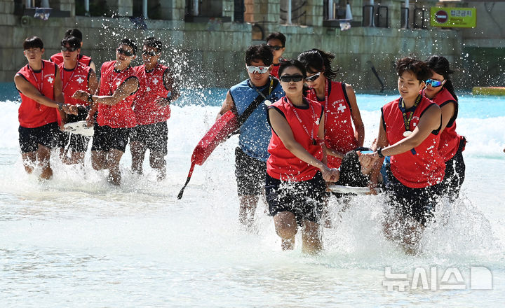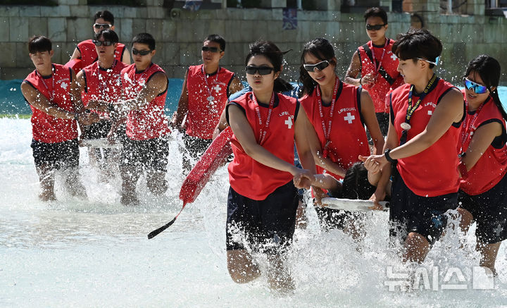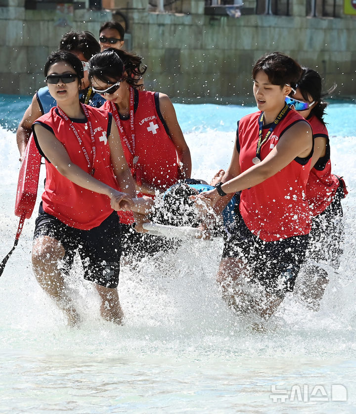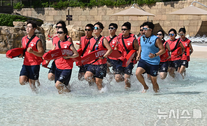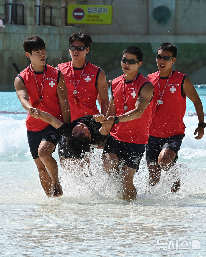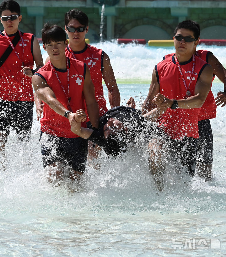 【NEWSIS】京畿道竜仁市のエバーランド・カリビアンベイで4日、本格的な水遊びシーズンを前に、ライフガード(水上安全員)が救助訓練を行っている様子。