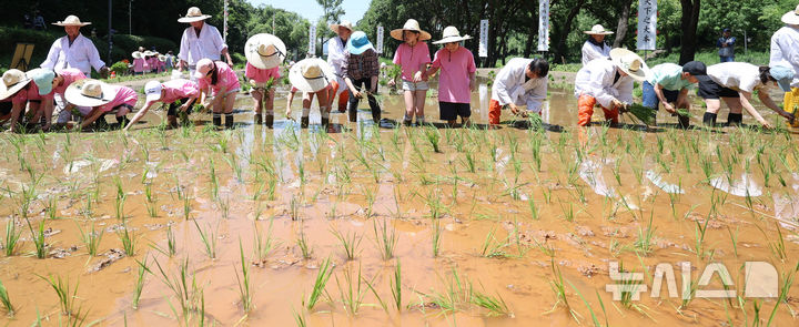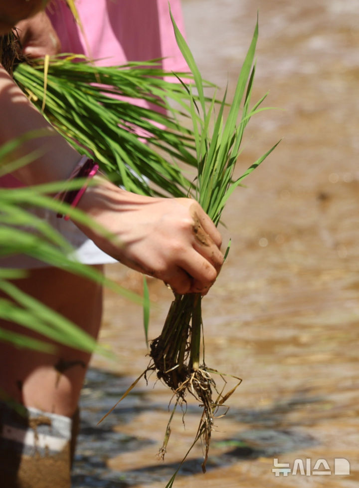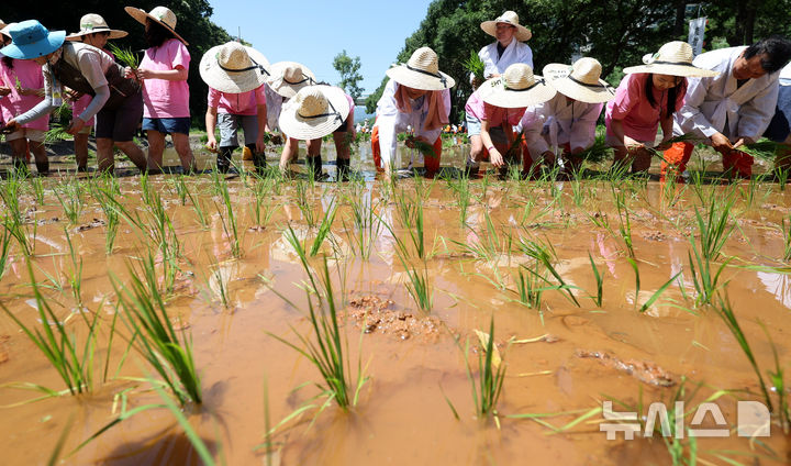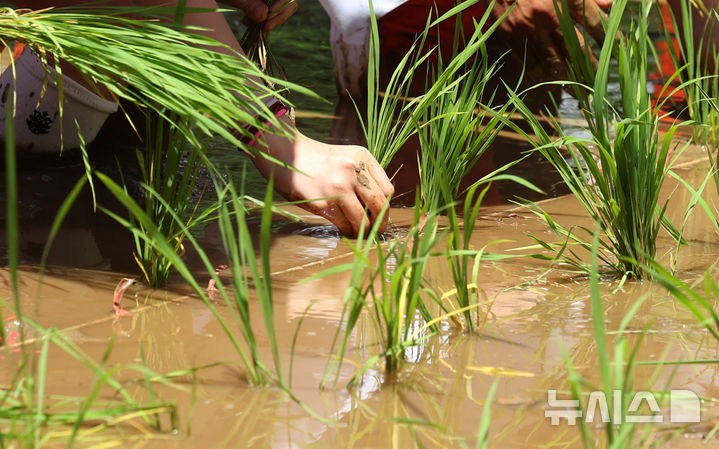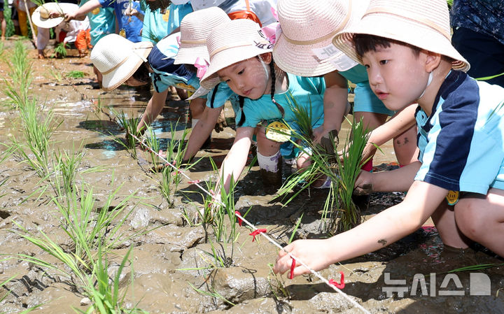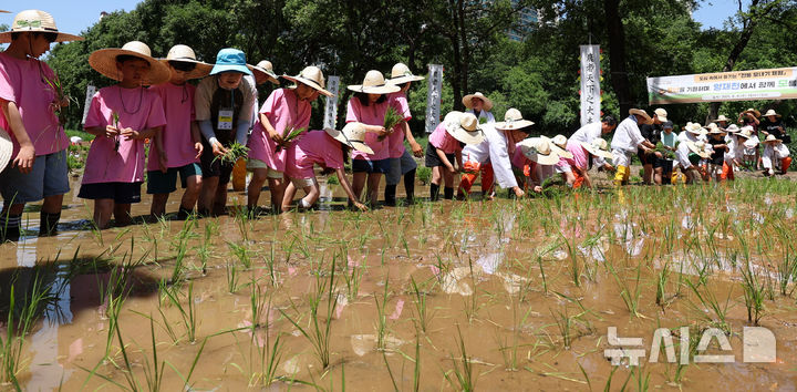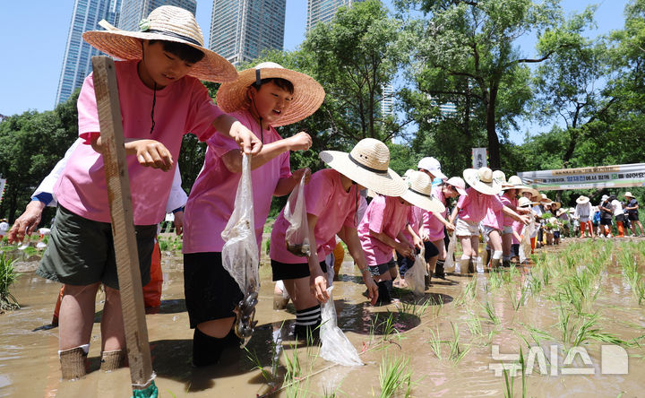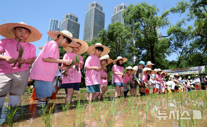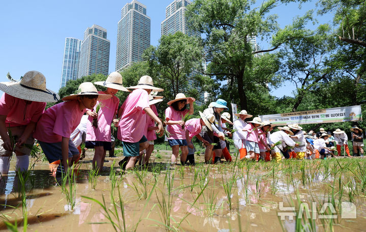 4日午前、ソウル市江南区の良才川稲作学習場で開かれた「都心の伝統田植え行事」で、田植え体験をしている子どもたち。