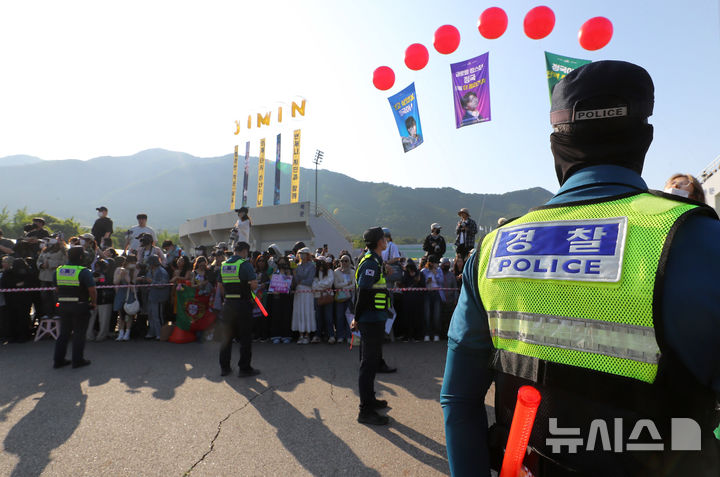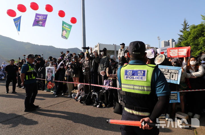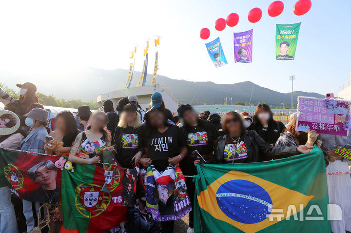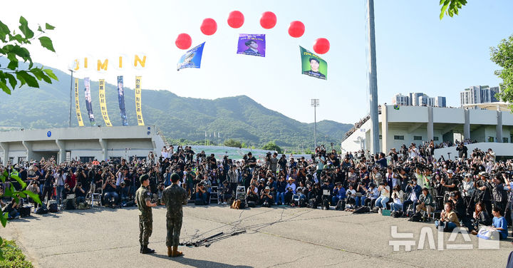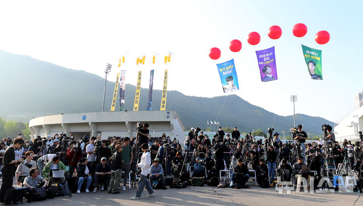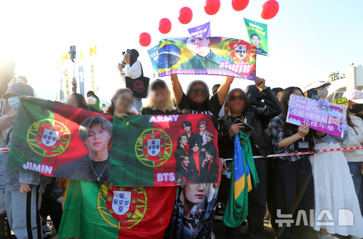【NEWSIS】グローバル・スーパー・グループBTS(防弾少年団)のメンバー、JIMIN(ジミン、29)=パク・ジミン=とJUNG KOOK(ジョングク、27)=チョン・ジョングク=が除隊する11日午前、京畿道漣川郡のある部隊の近くで、垂れ幕を掲げるARMY(アーミー=BTSのファン)たち。