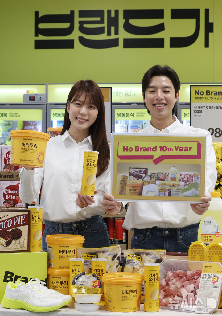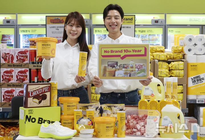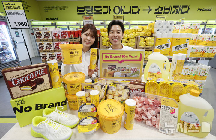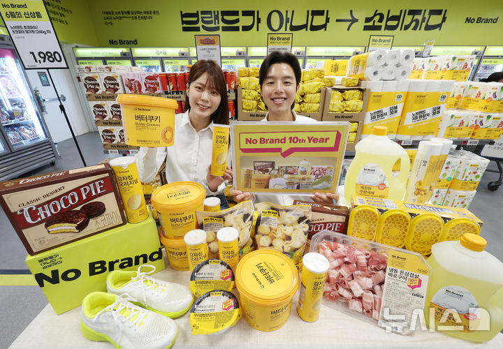 【NEWSIS】ソウル市竜山区の大手スーパー「Eマート竜山店」で11日、「No Brand誕生10周年」に合わせたお客様感謝イベントをPRしているコンパニオンの様子。