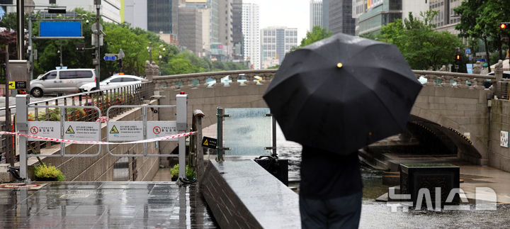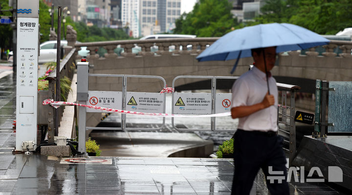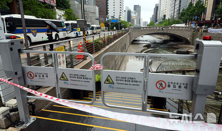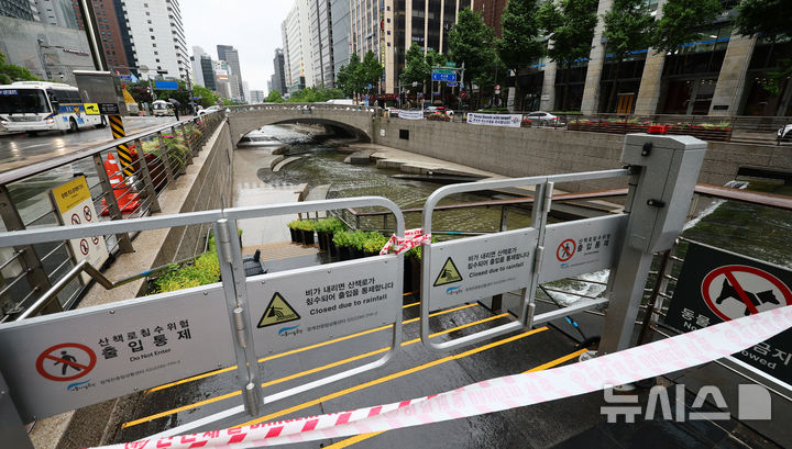 【NEWSIS】ソウル市と江原道の一部地域に豪雨注意報が発令された20日午前、立ち入りが規制されたソウル・清渓川散策路。