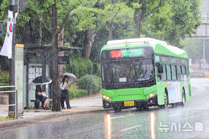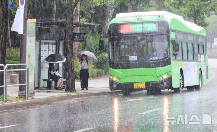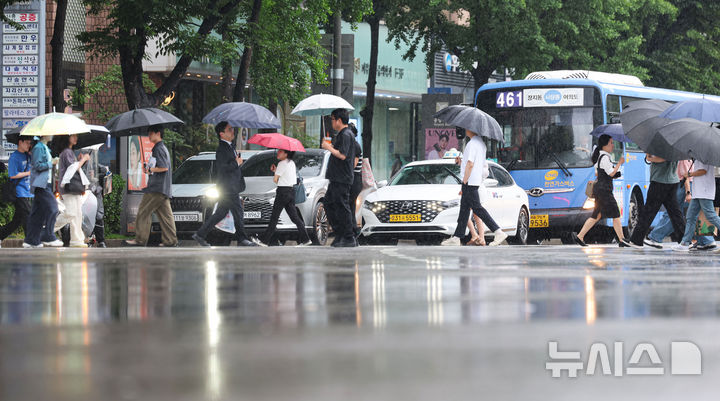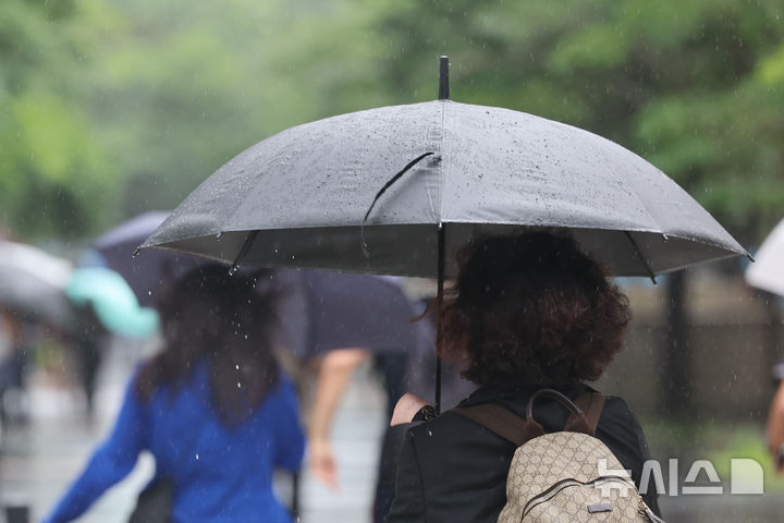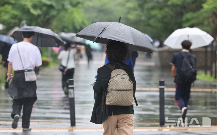 【NEWSIS】本格的な梅雨が始まった20日、ソウル・汝矣島駅近くで、雨傘を差して行き交う市民の様子。