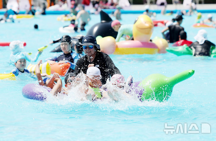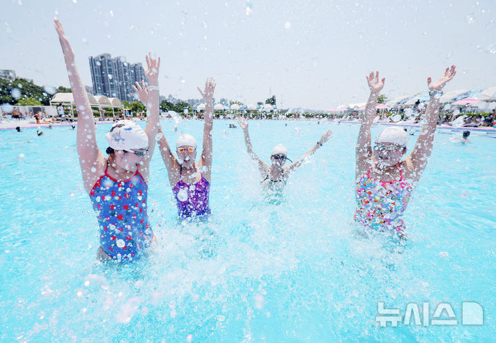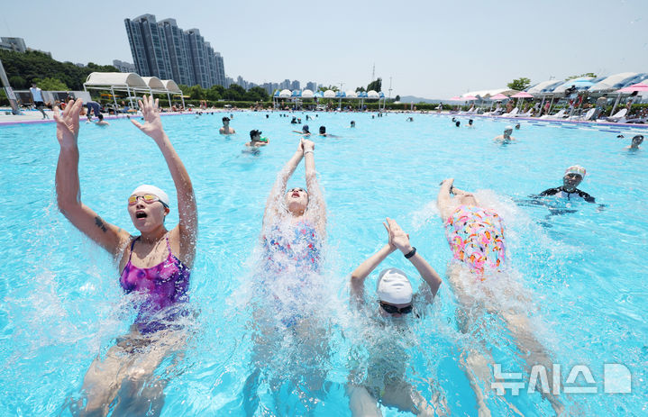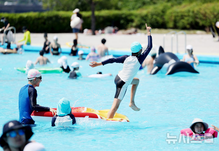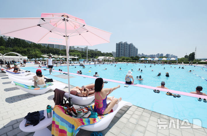 【NEWSIS】蒸し暑い一日となった22日、ソウル市瑞草区の蚕院漢江公園プールを訪れ、週末の楽しいひとときを過ごす人々。トゥクソム・汝矣島・蚕院の各漢江公園プールと、蚕室・楊花・蘭芝の各漢江公園水遊び場は8月31日まで73日間オープンする。