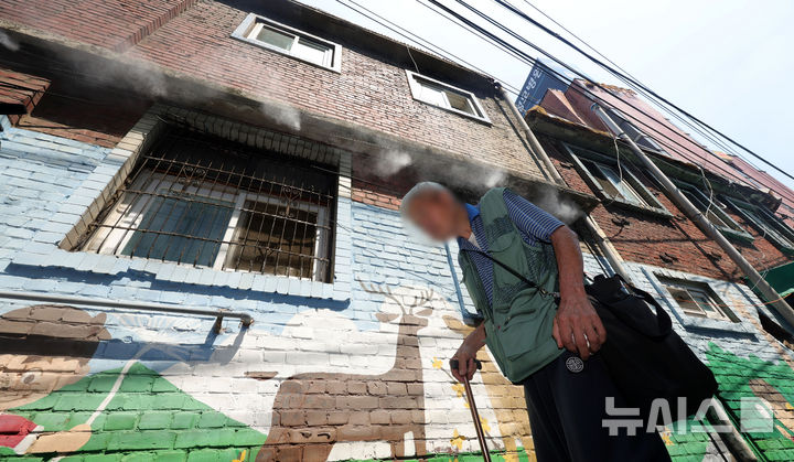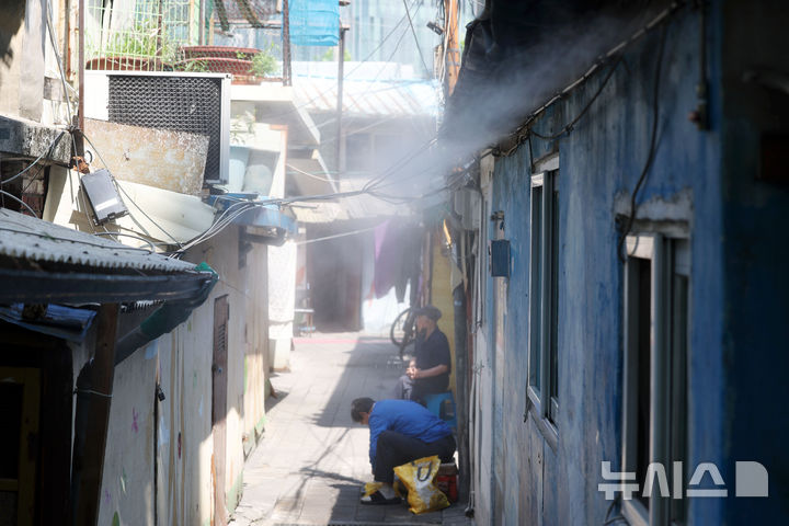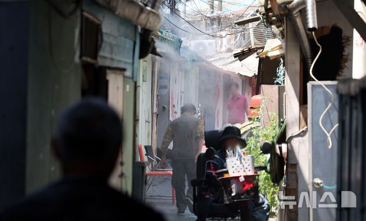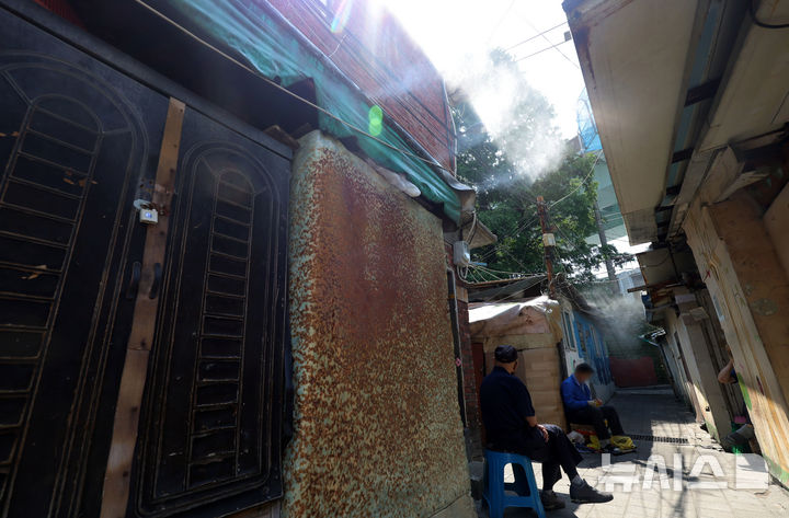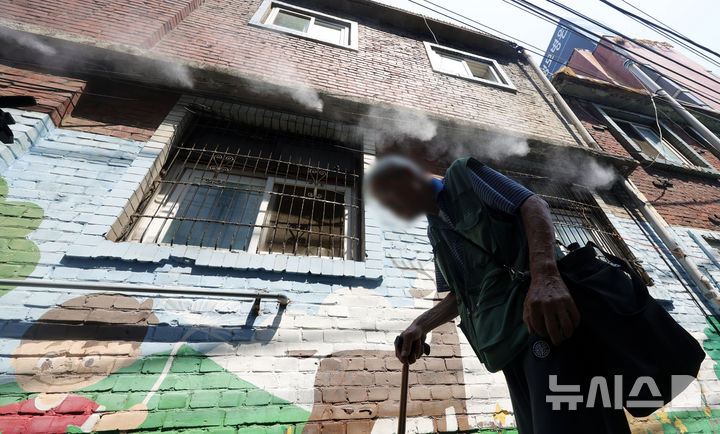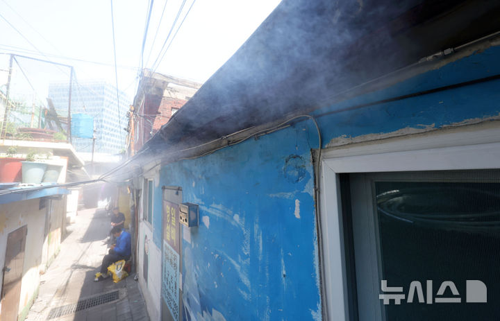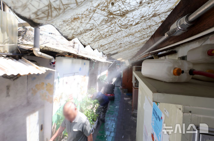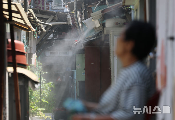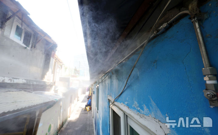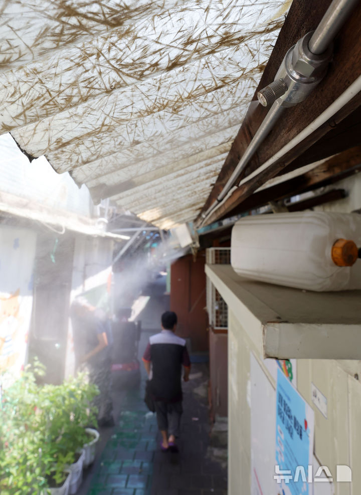 【NEWSIS】ソウルの昼間の最高気温が32度まで上昇し、暑い一日となった23日、ソウル市永登浦区のチョクパン村(小部屋村。貧困層が多数居住する)の街角にあるクーリングフォグが稼働している様子。