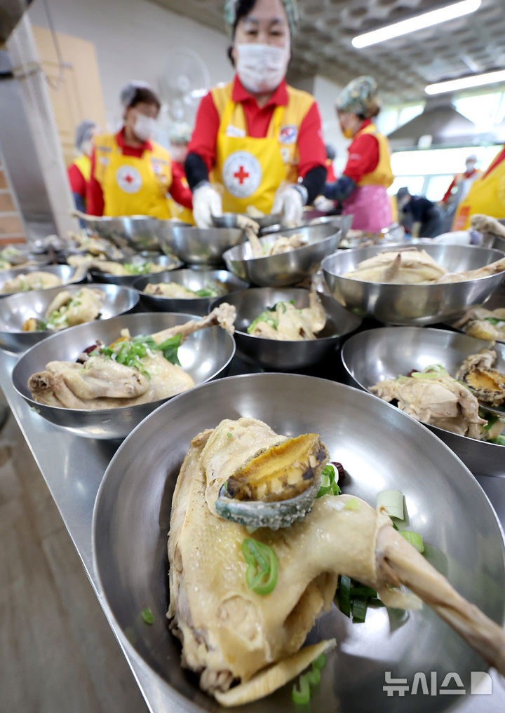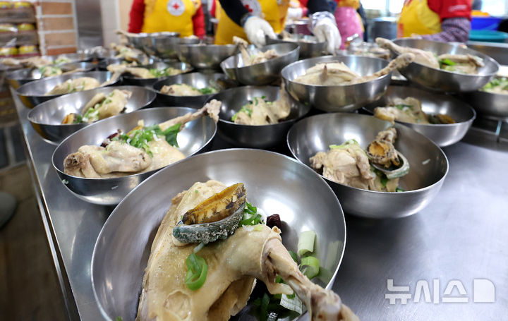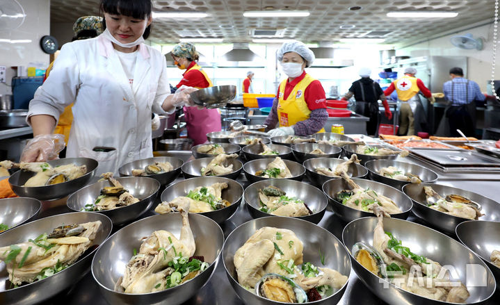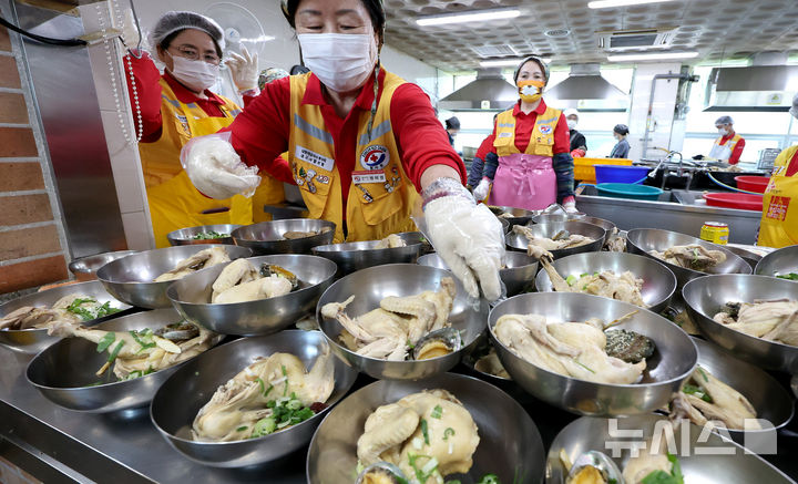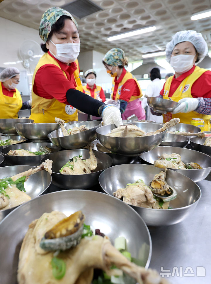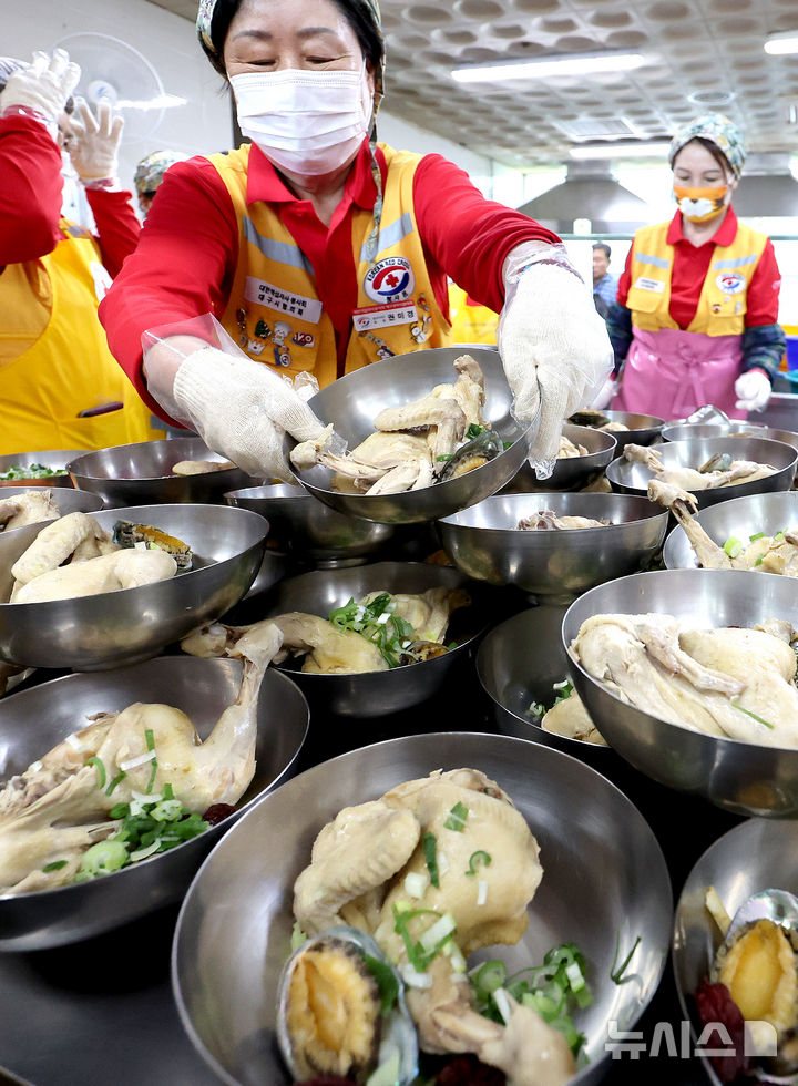 【NEWSIS】韓国各地で30度前後の暑さとなった23日、大邱市の達西区老人総合福祉館で開かれたiMバンク・赤十字共同の「福サムゲタン分かち合い」イベントで、ボランティアがサムゲタンの配食準備をしている様子。
