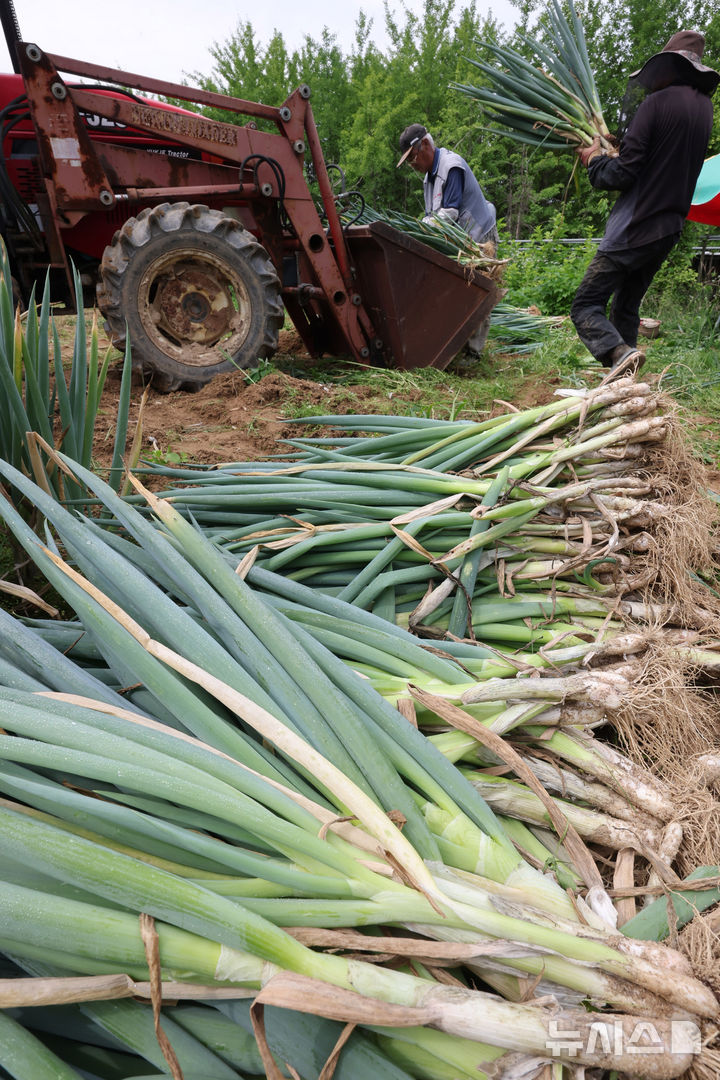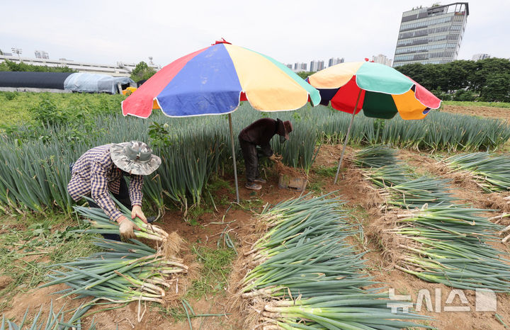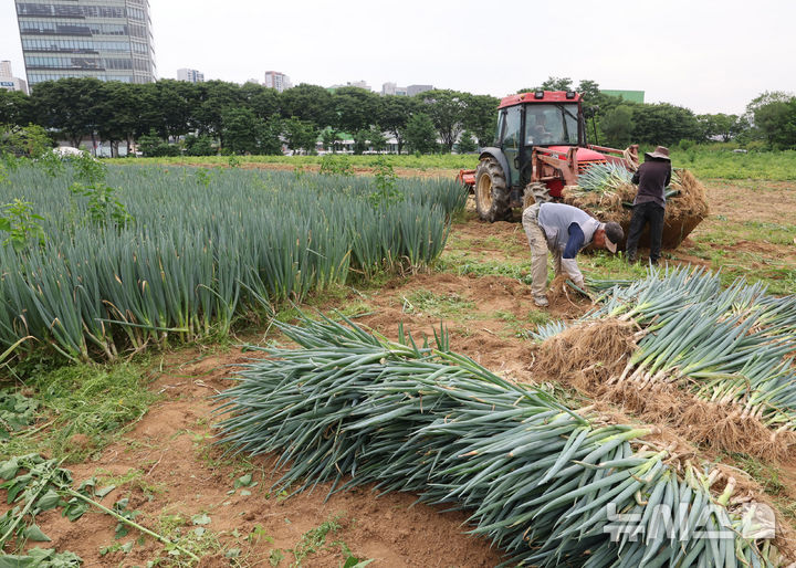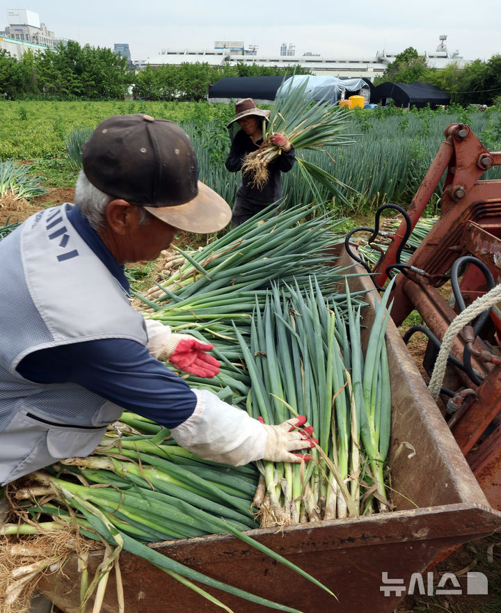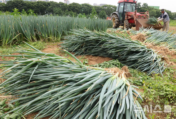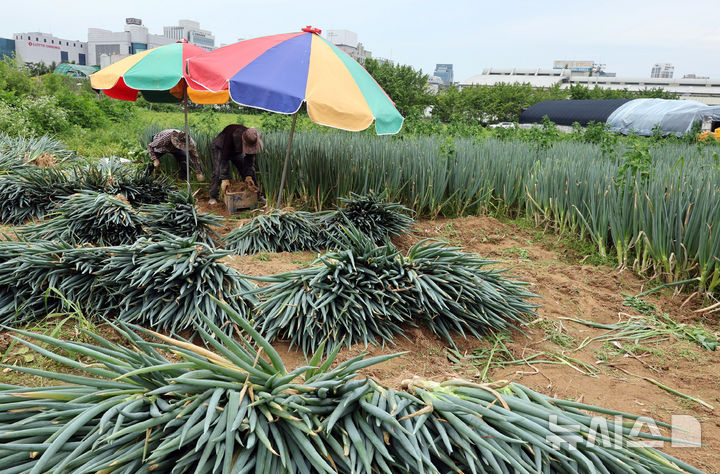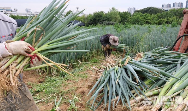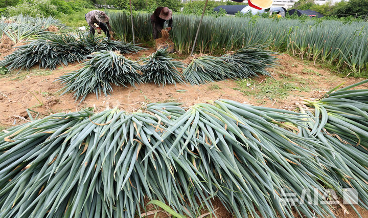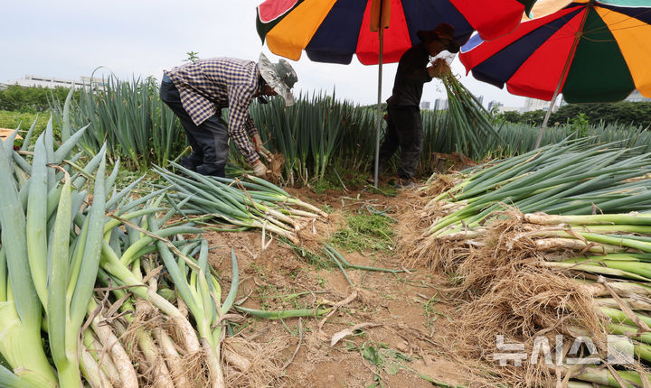 【NEWSIS】24日午前、仁川市南洞区のネギ農場では猛暑の中、梅雨時の集中豪雨に備えて従業員がネギの収穫を行っていた。