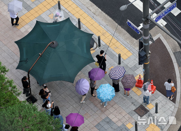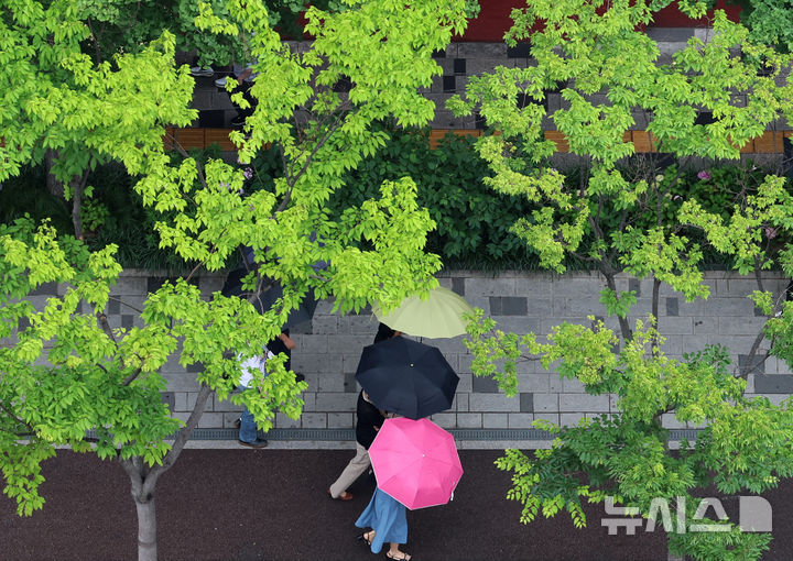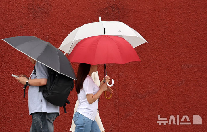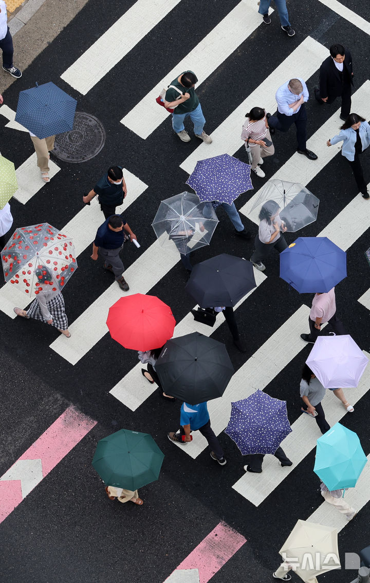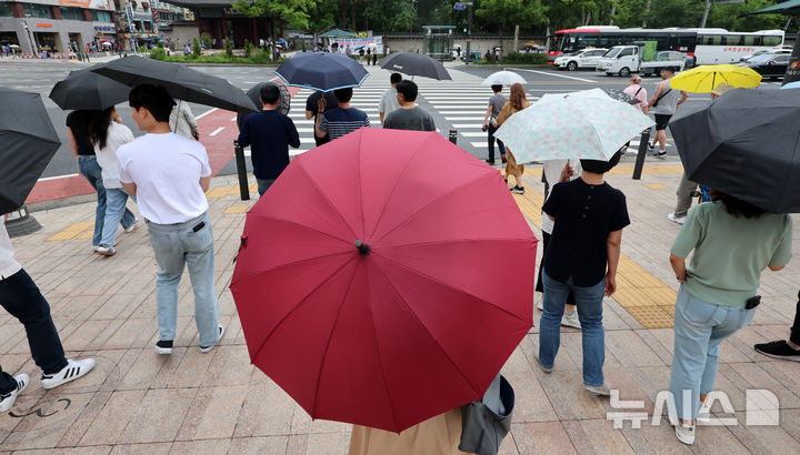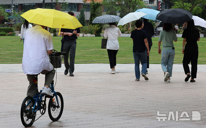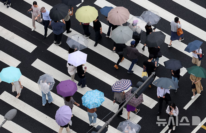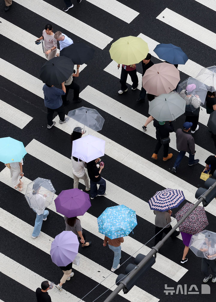 【NEWSIS】梅雨前線の影響で雨天となった25日午後、ソウル市中区のソウル市庁近くで、雨傘を差して行き交う市民の様子。