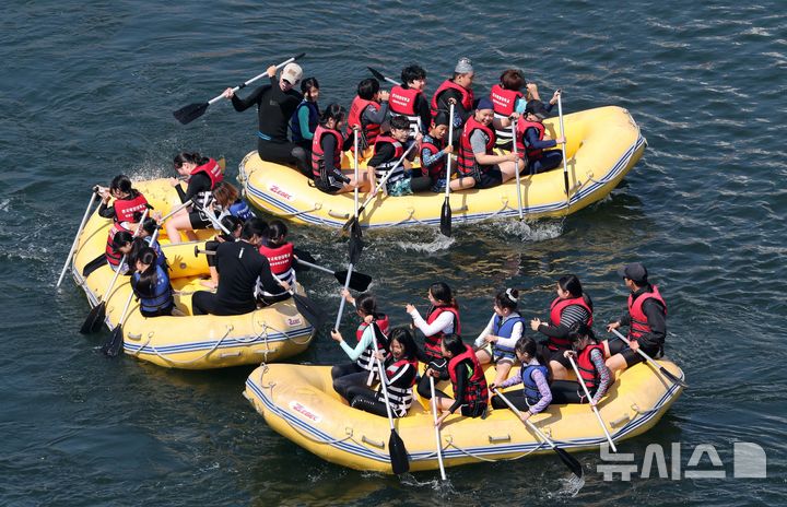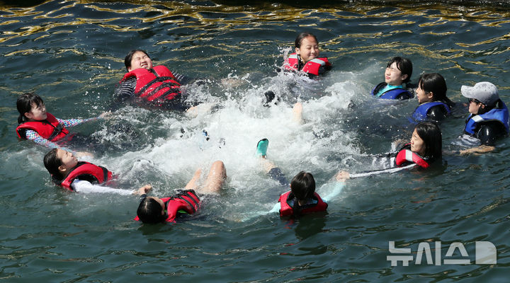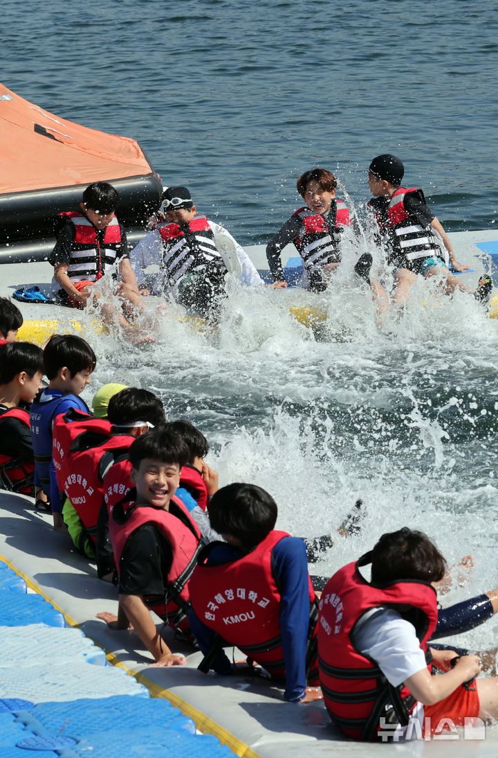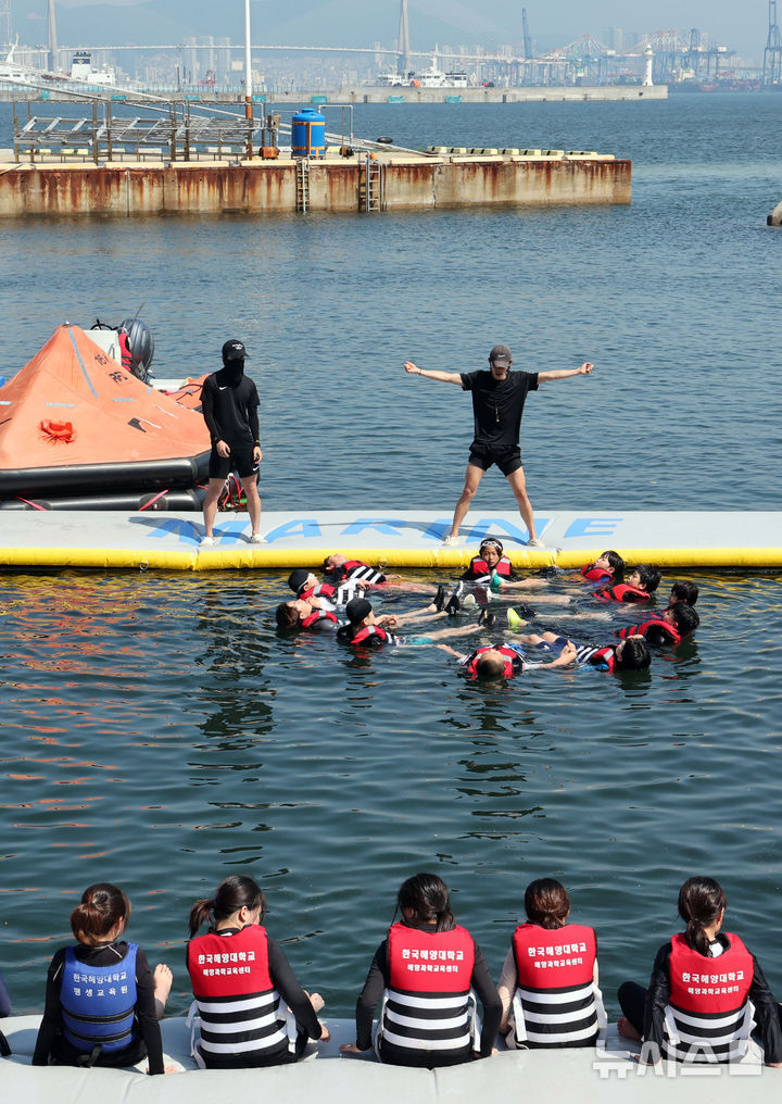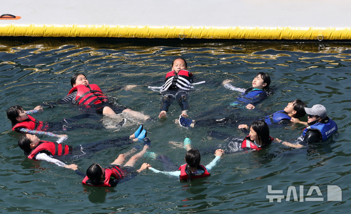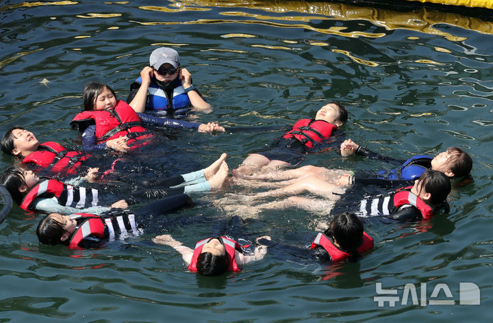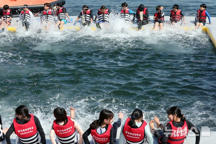 「2025年小学生海の生存水泳教育課程」が開かれた26日、釜山市影島区の韓国海洋大学海上教育場で、小学生が海の生存水泳法を学んでいる様子。