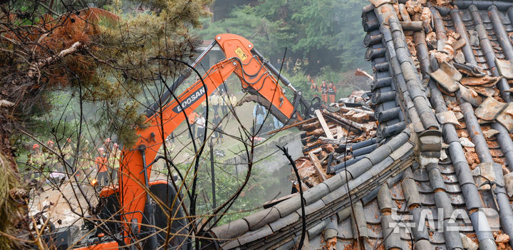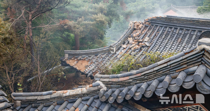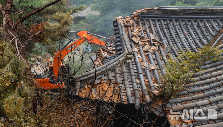 【NEWSIS】30日午後、ソウル市城北区の名勝「成北洞別墅(べっしょ)」にある松石亭で火災が発生し、消防隊員が重機を用いて消火作業を行っている様子。