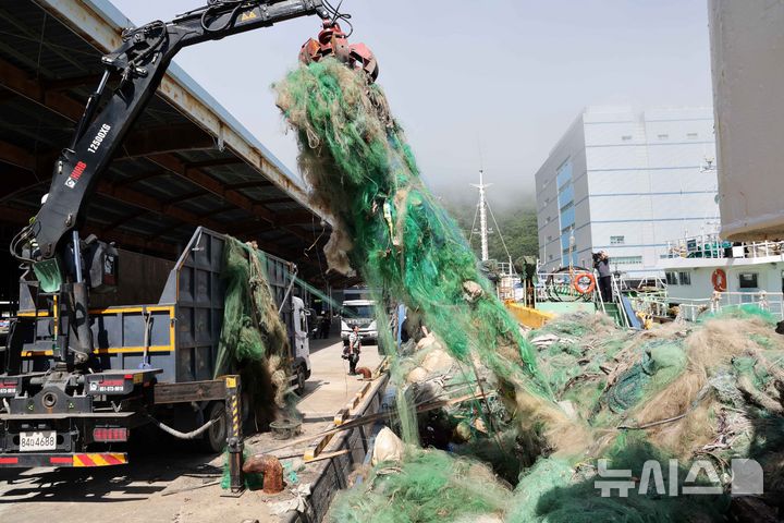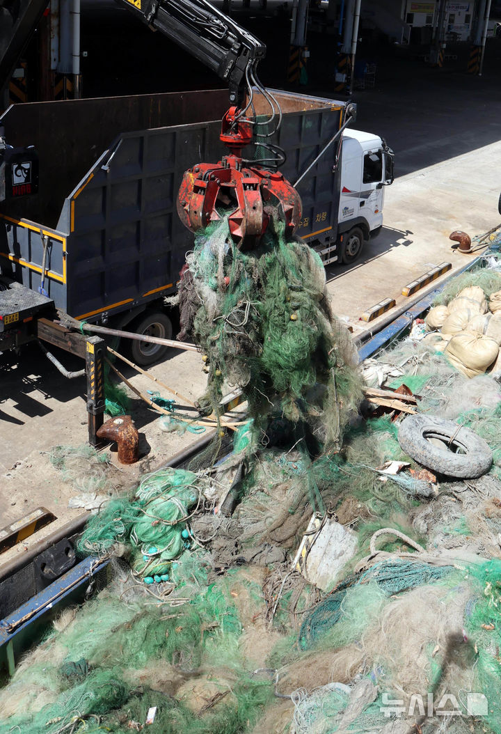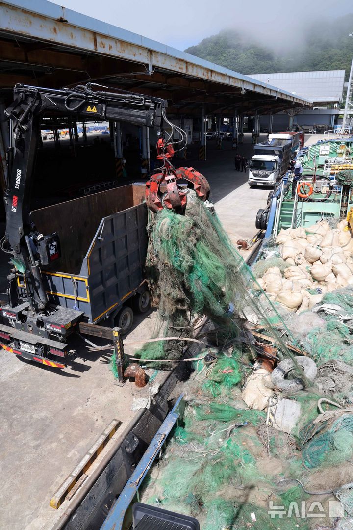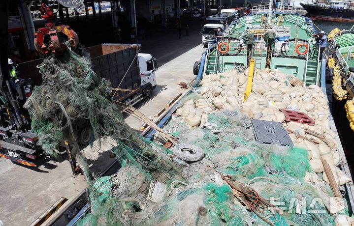 【NEWSIS】釜山市西区の釜山水産物共同販売場で30日、大型機船底曳網水協が、済州近海で回収した海底ゴミを運搬船から降ろすため重機を用いて荷役をしている様子。