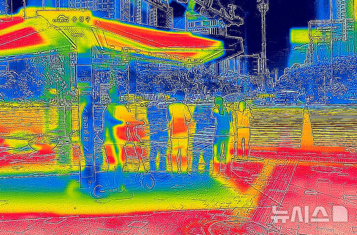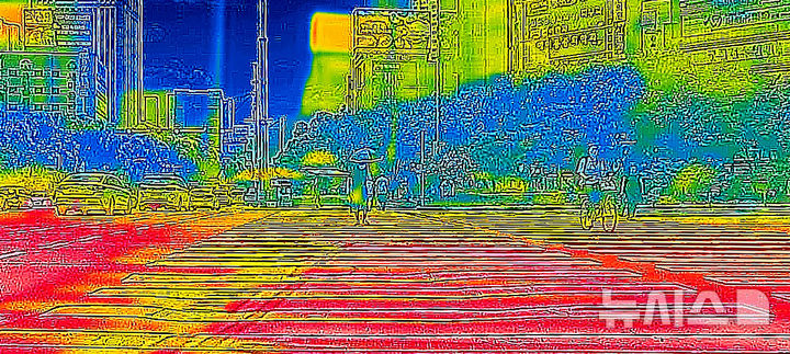 【NEWSIS】猛暑が続いている2日、大邱市寿城区の泛魚交差点で、大きな日よけの下に集まって横断歩道の信号が変わるのを待っている市民の様子。