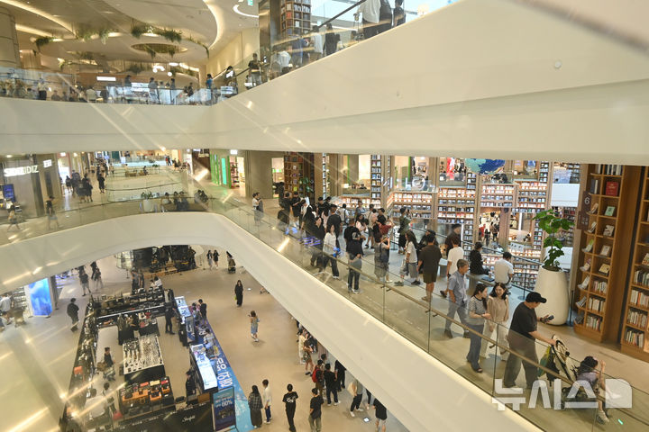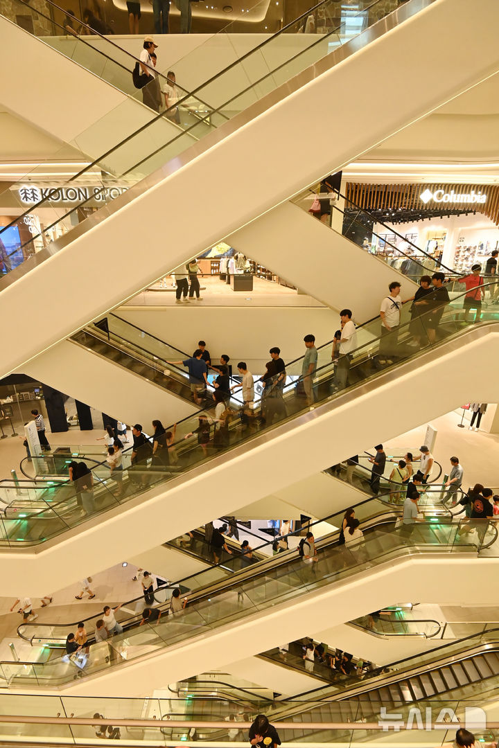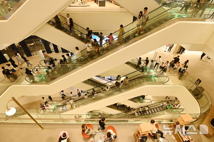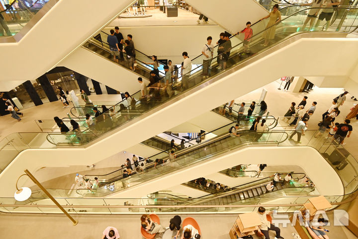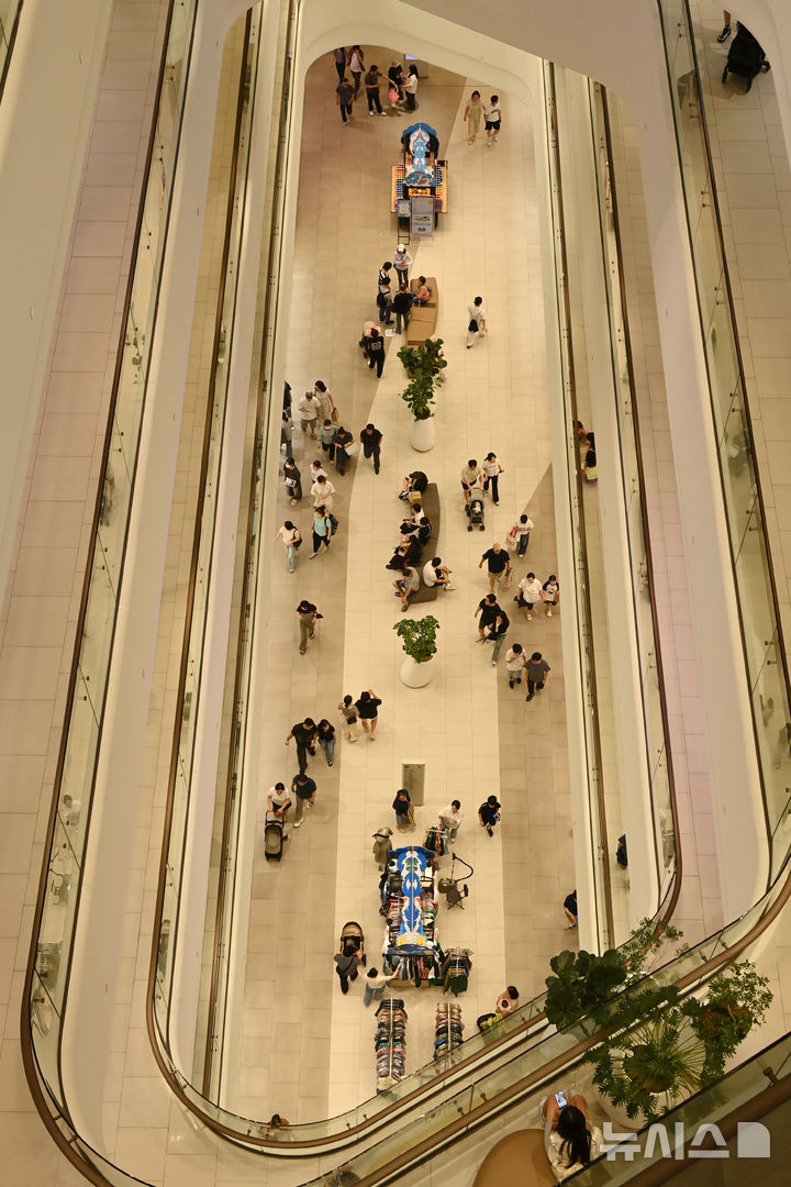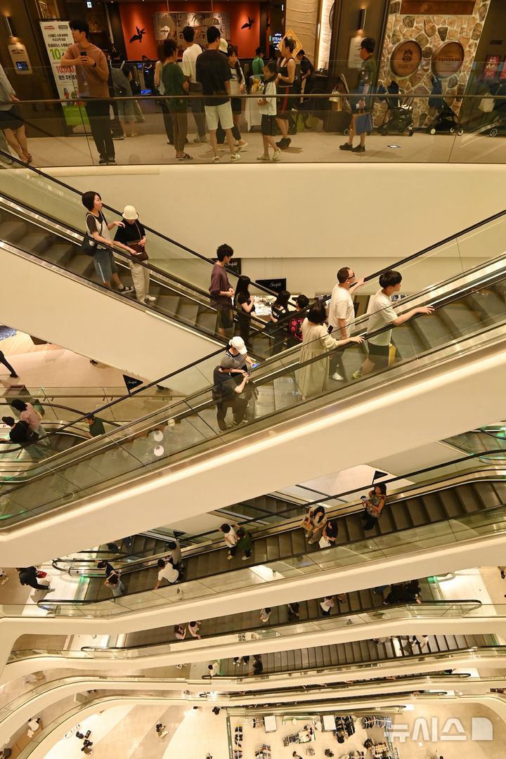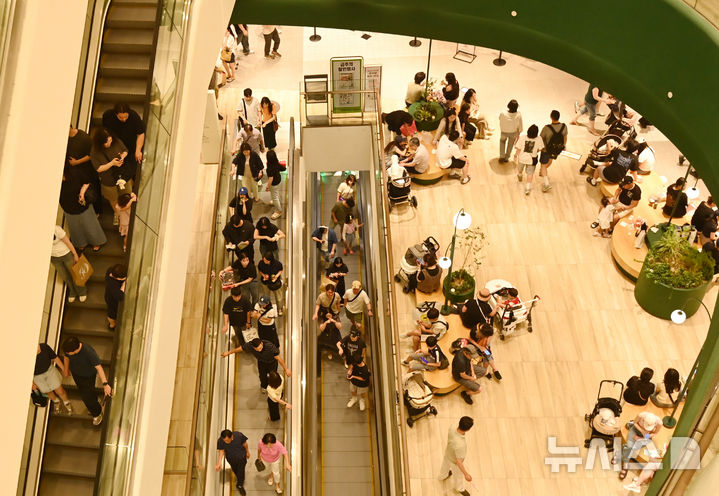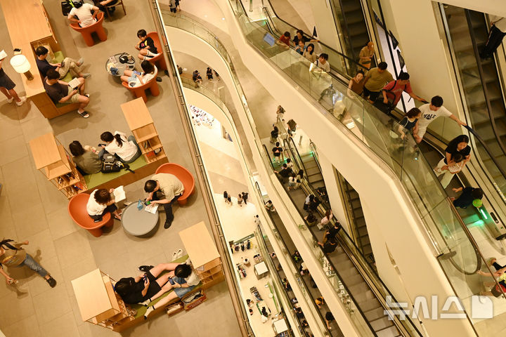 【NEWSIS】韓国のほぼ全域で猛暑注意報・警報が発令された6日、京畿道水原市内のショッピングモール「スターフィールド水原」は、暑さを避けて買い物に来た人々でにぎわっていた。