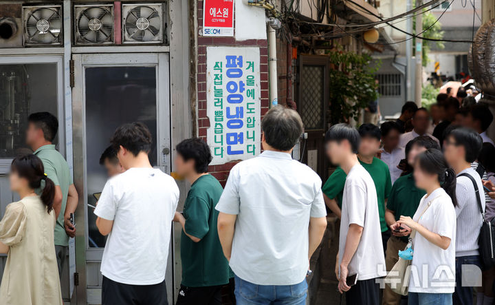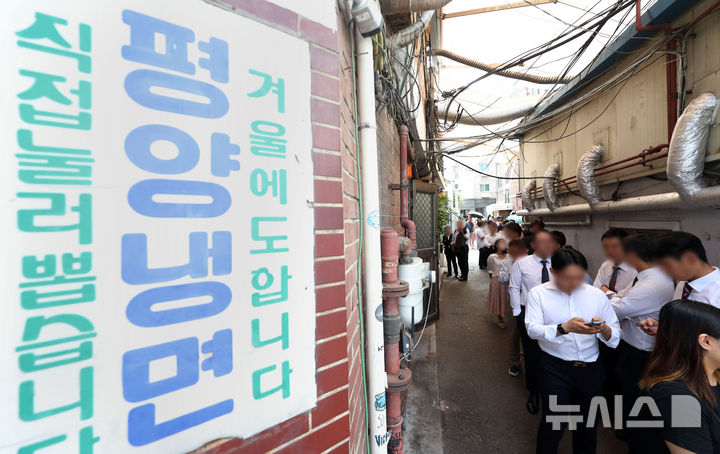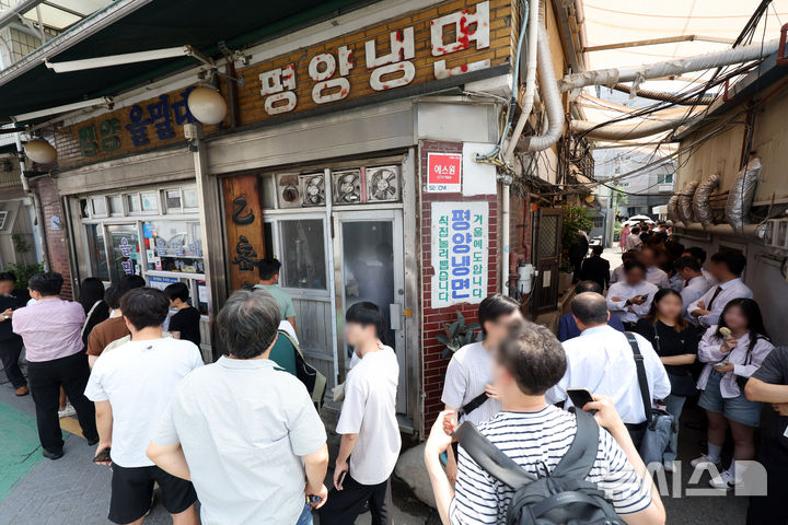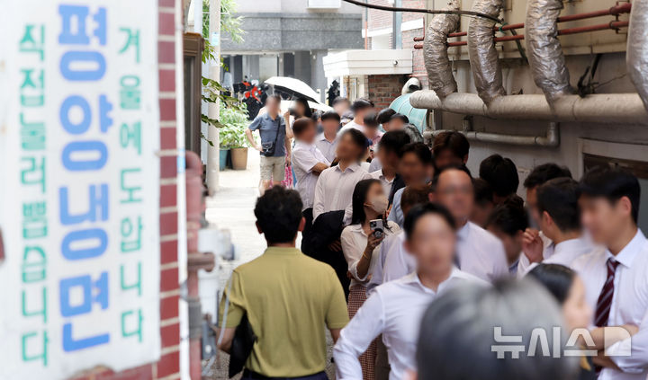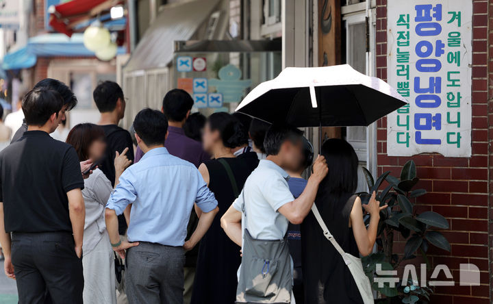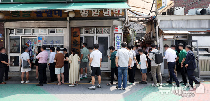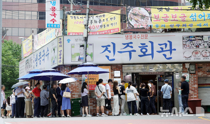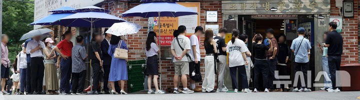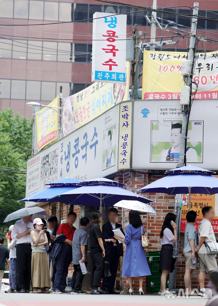【NEWSIS】連日の蒸し暑さの中、ソウル市内のある冷コングクス(豆乳スープ麺)専門店では8日、訪れた市民が入店待ちをしていた。