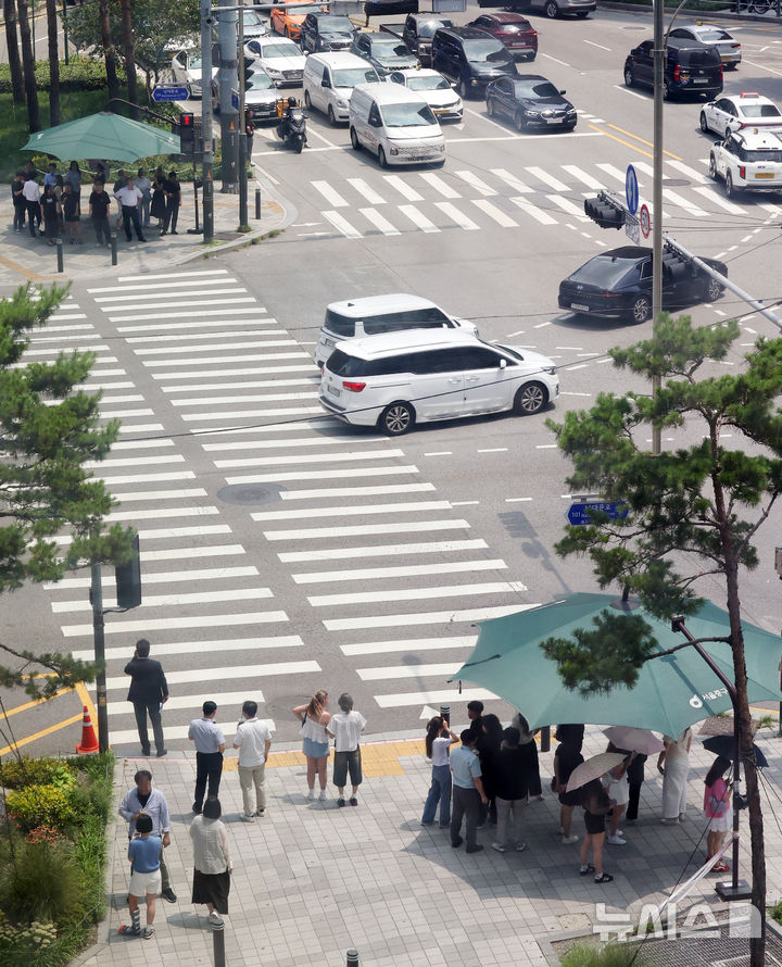 【NEWSIS】ソウル地域で猛暑特報の発令が続いている8日、中区乙支路1街の交差点では、市民が日差しを避けて日よけの下で信号待ちをしていた。