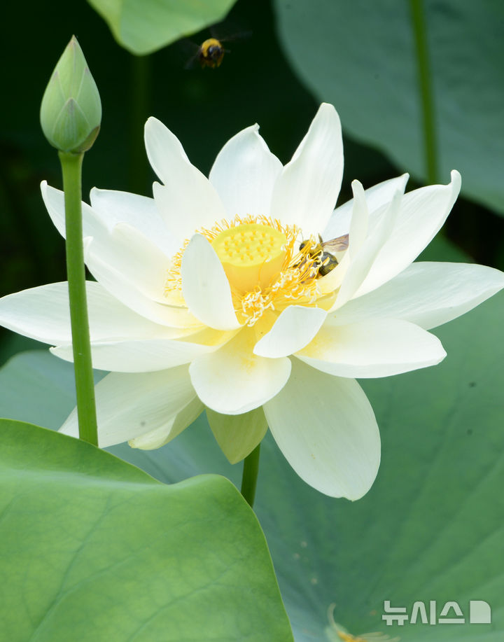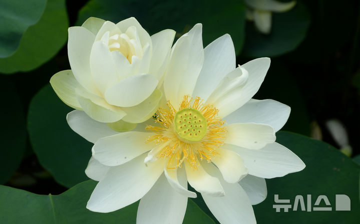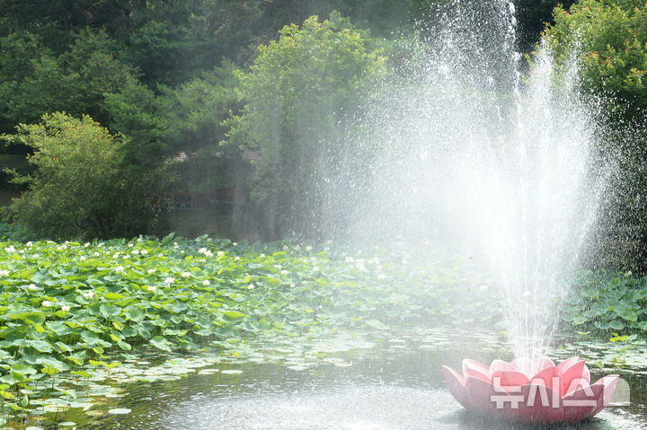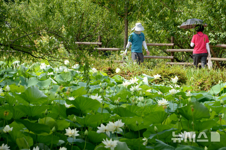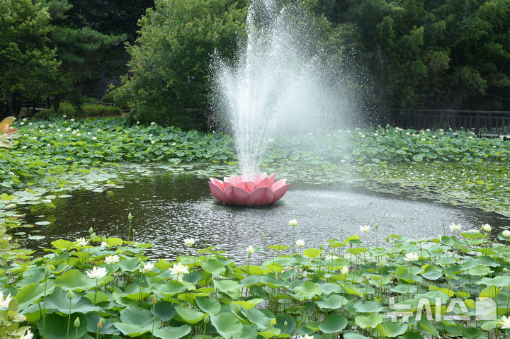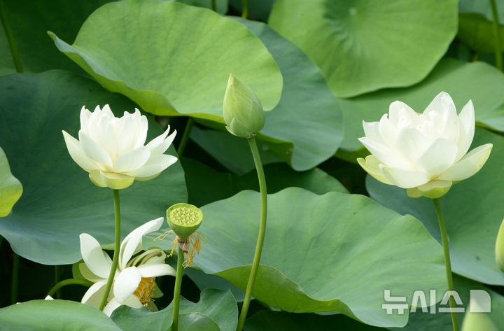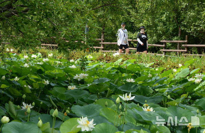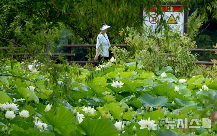 【NEWSIS】厳しい暑さが連日猛威を振るう中、蔚山市南区の仙岩湖水公園では10日午前、公園内のハス池でハスの花が大きく開いていた。