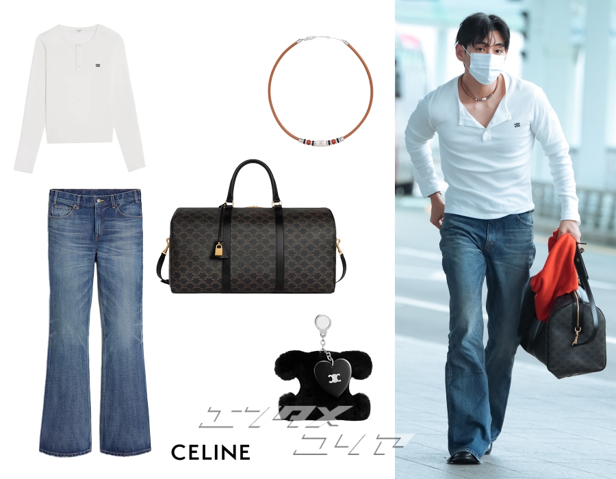 Vはこの日、スリムなデザインのヘンリーネックの白い長袖Tシャツを着て、シンプルで上品な雰囲気を漂わせていた。これにブルーのブーツカット・デニムパンツを組み合わせることで、レトロで現代的な感性を表現し、トップスとボトムスのバランスを絶妙に生かして完成度の高いスタイリングを披露した。