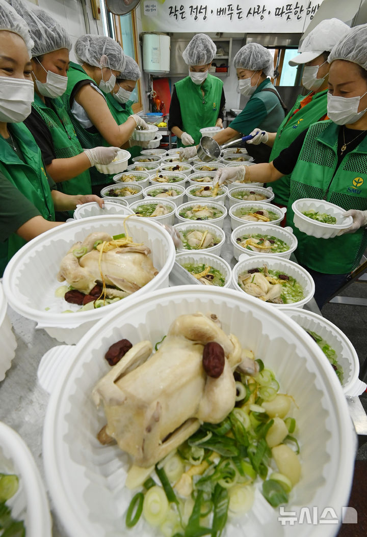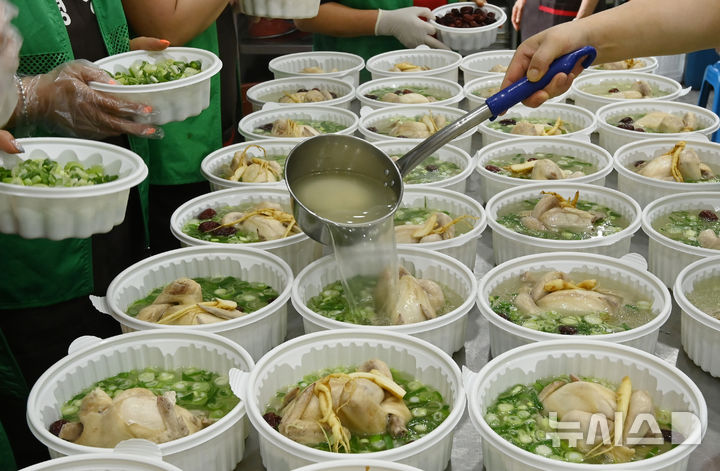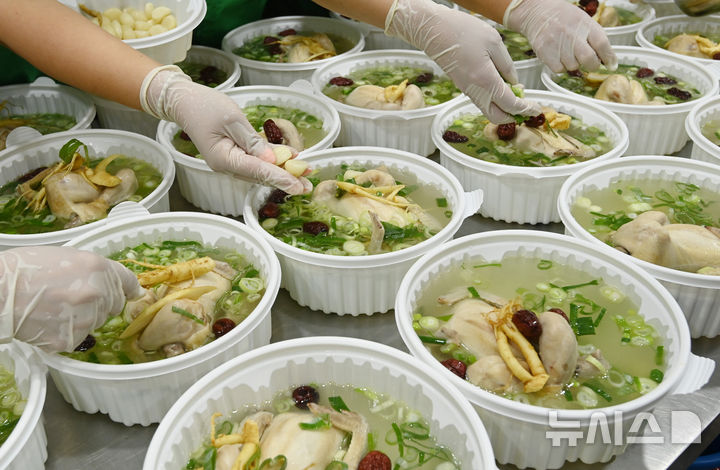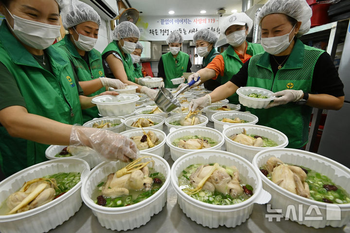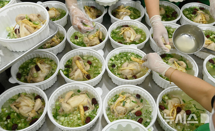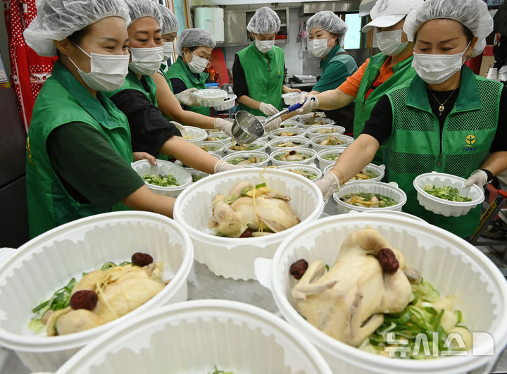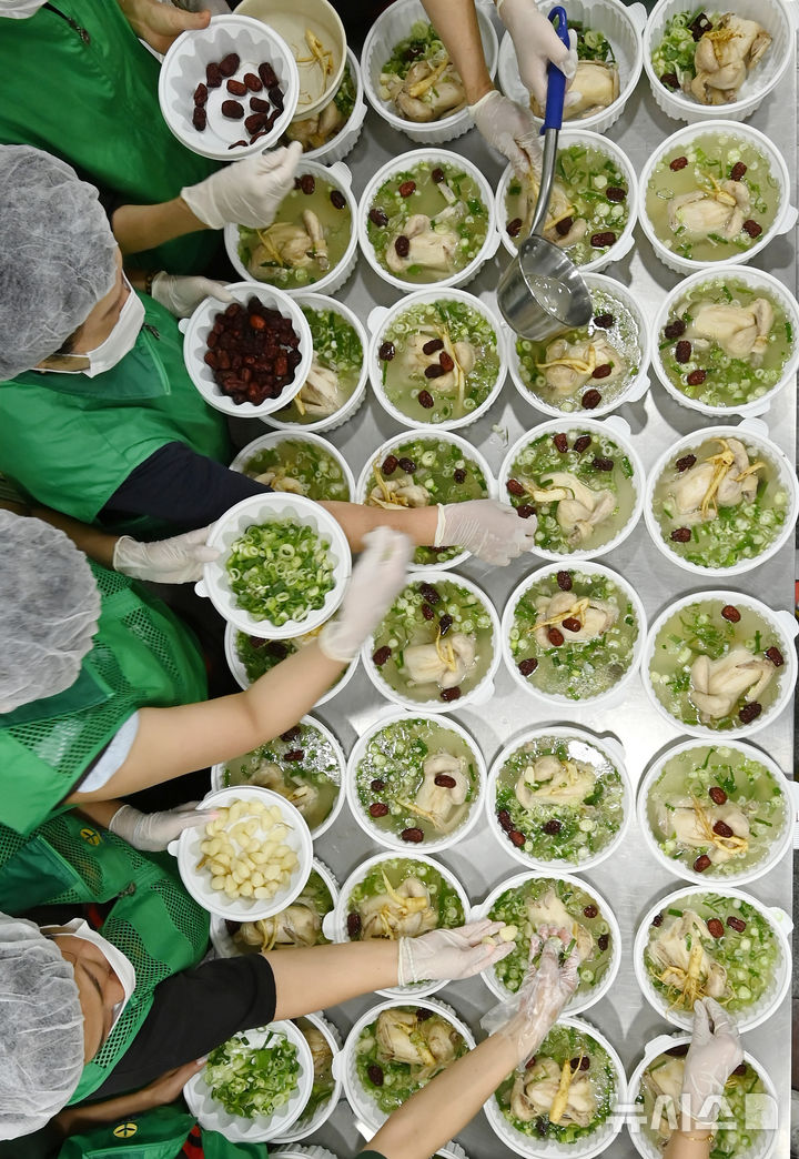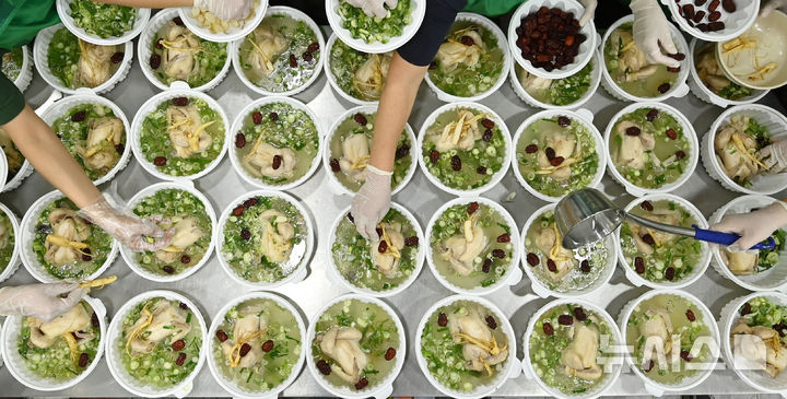 【NEWSIS】京畿道水原市坪洞の行政福祉センターで15日、セマウル婦女会の関係者らが、一人暮らしの高齢者など恵まれない階層に届けるサムゲタンを作り、容器に入れているところ。