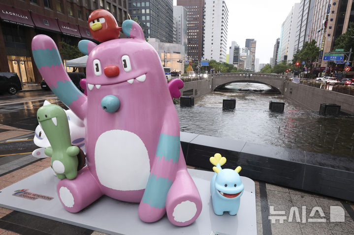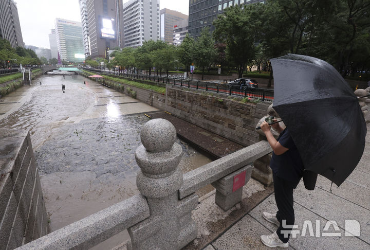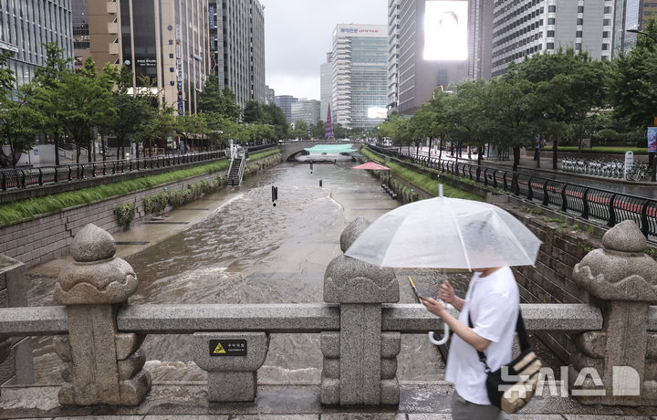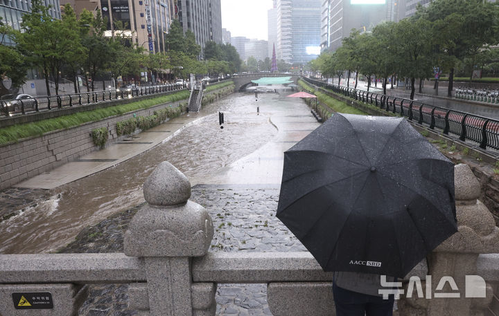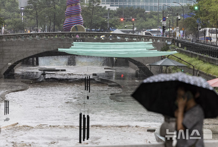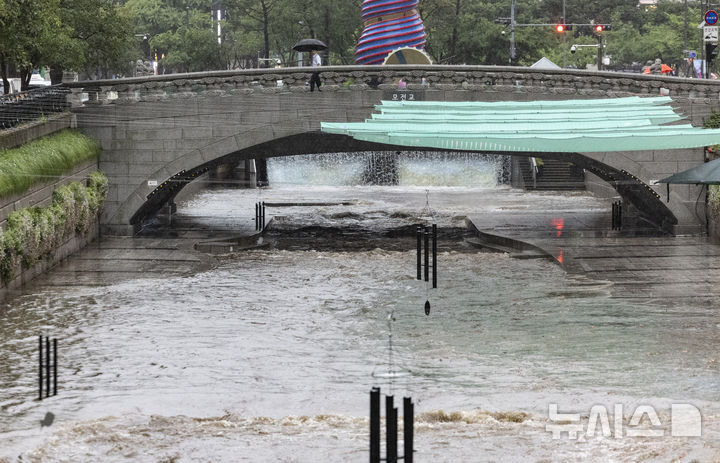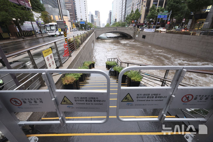 【NEWSIS】ソウル地域に強い雨が降った17日、ソウル市鍾路区の清渓川にかかるモジョン橋付近では遊歩道の立ち入りが禁止された。