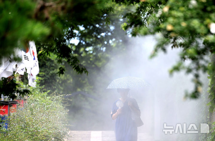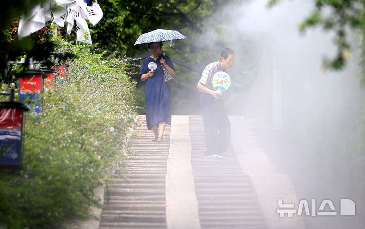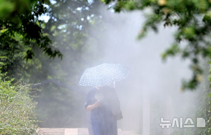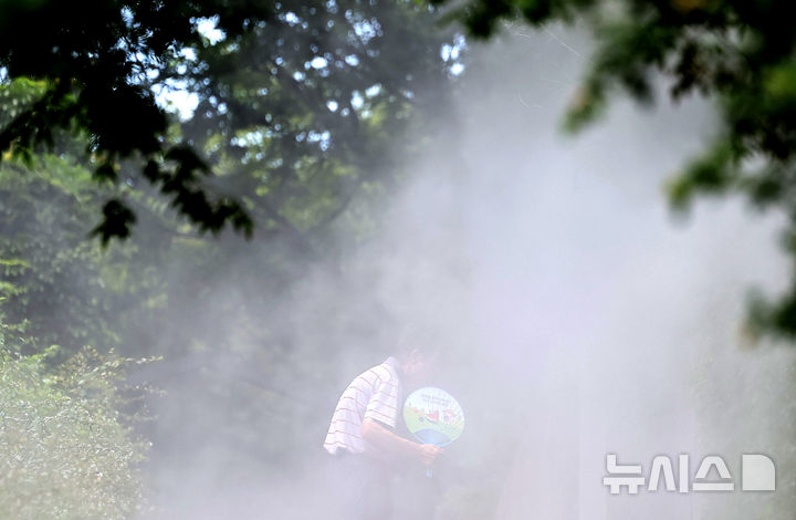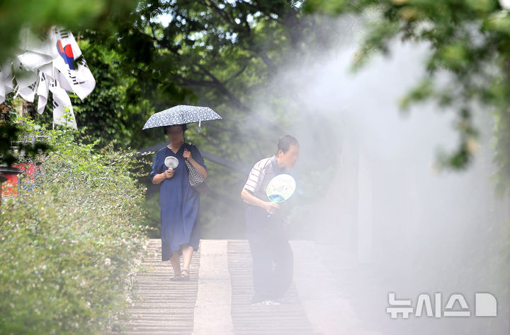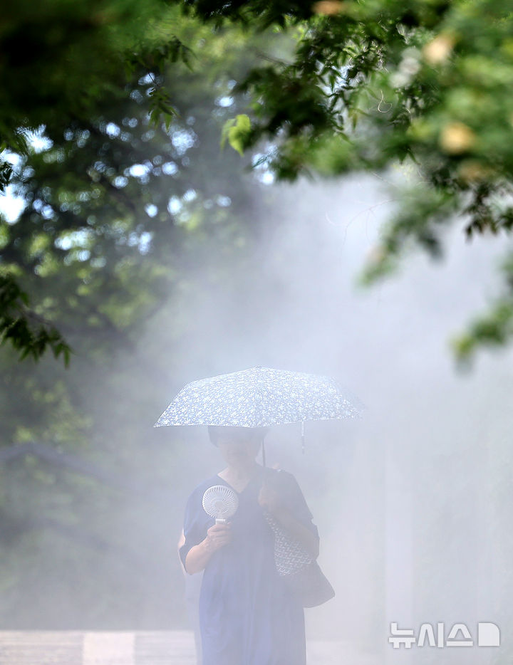 【NEWSIS】猛暑が続いている23日、大邱市中区の「青蘿の丘」に設置されたクーリングフォグの下を、手に扇風機や団扇を持って行き交う市民の様子。