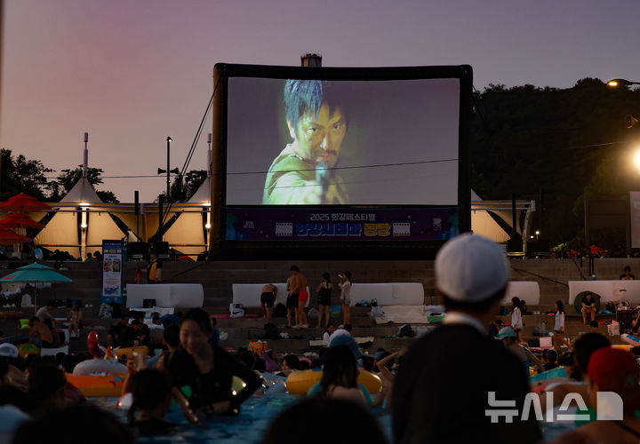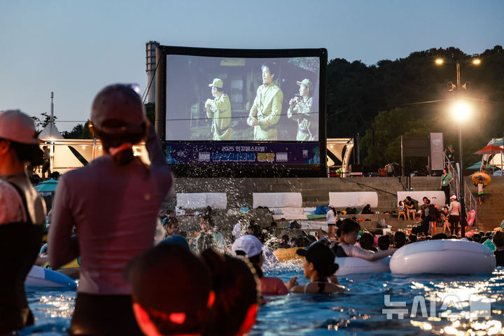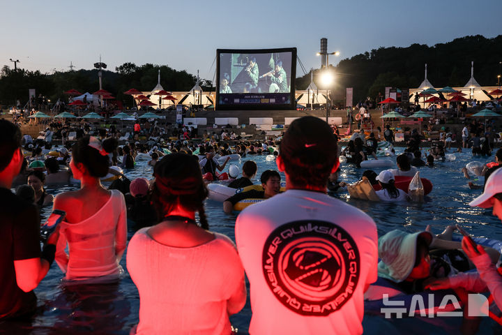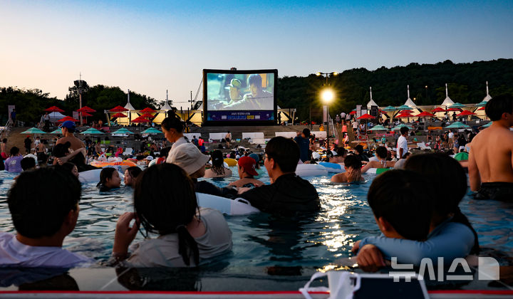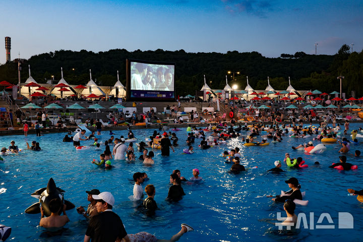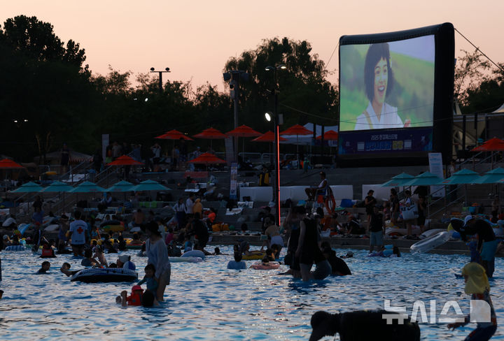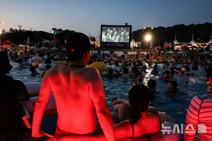 【NEWSIS】27日午後、ソウル市麻浦区の蘭芝漢江公園プールで、漢江フェスティバル「漢江シネマ『ポンダン』」の映画をプールの中で鑑賞する人々。