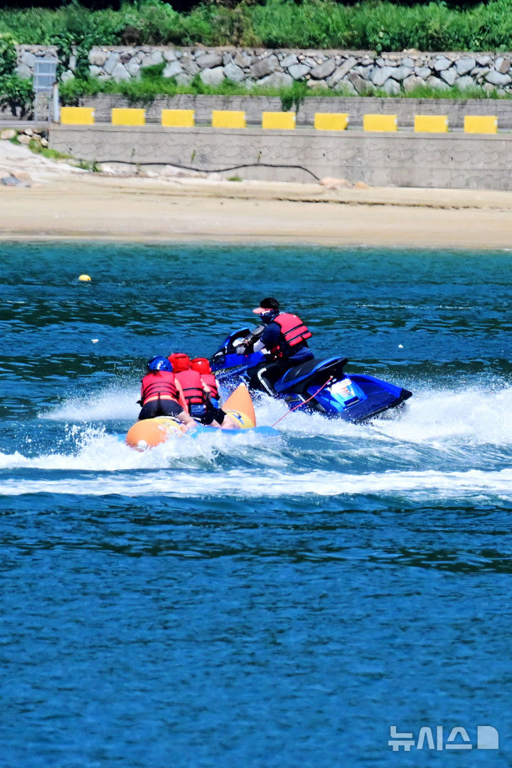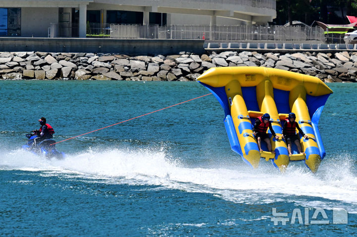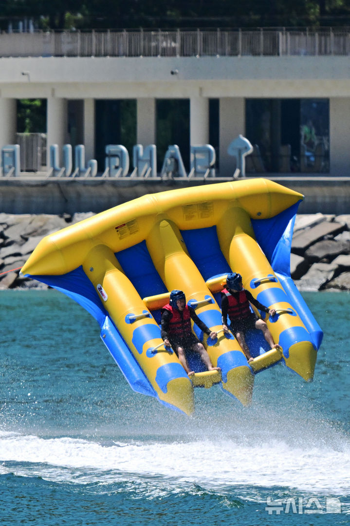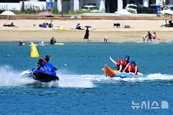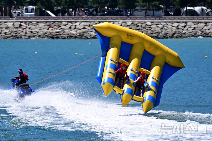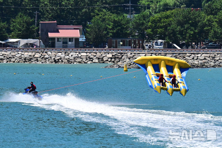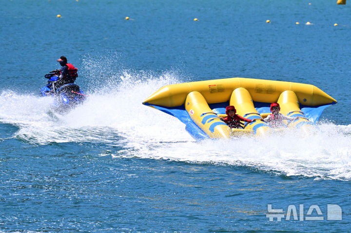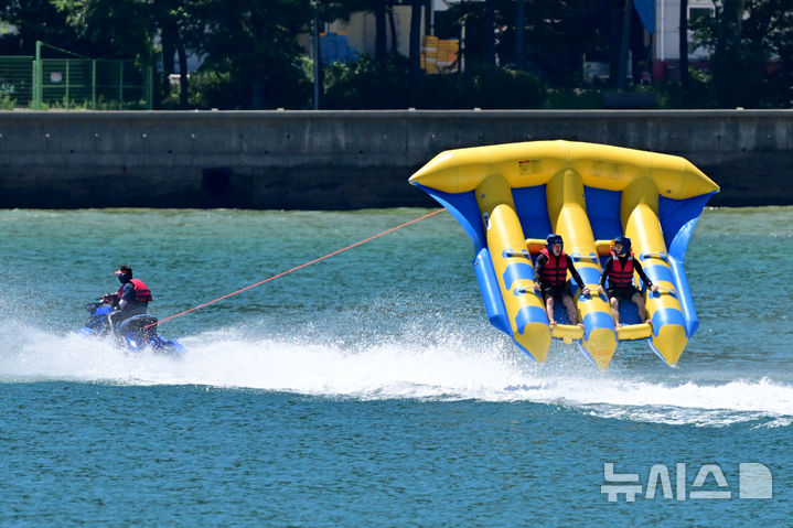 【NEWSIS】韓国の大部分に猛暑特報が発令された28日午後、慶尚南道南海郡の尚州銀砂ビーチでは、避暑に訪れた人々が「フライングフィッシュボート」に乗って暑さを紛らわせていた。
