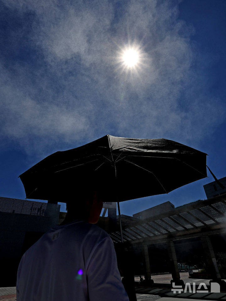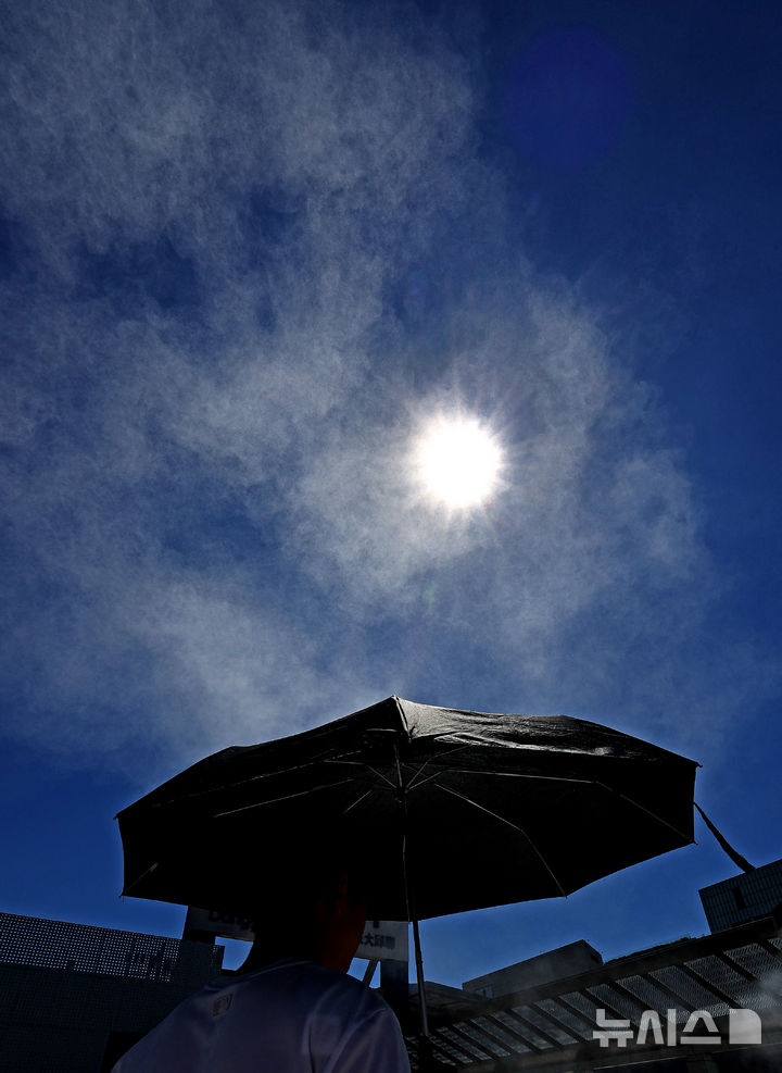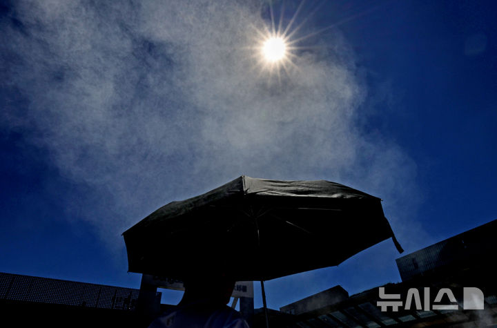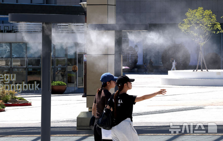 【NEWSIS】連日猛暑が続いている29日、大邱市東区の東大邱駅広場に設置されたクーリングフォグの下を、日傘を差して歩く市民の様子。