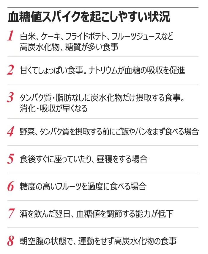 問題は、正確な基準なしに心配したり、過度なダイエットを行うケースだ。血糖値スパイクは一般的に、食前の血糖値よりも50mg/dL以上上昇したり、食後の血糖値が140以上の場合を意味する。例えば、甘いコーヒーを飲んだ後、血糖値が130くらいまで上昇するのは、正常な反応と見なすことができる。