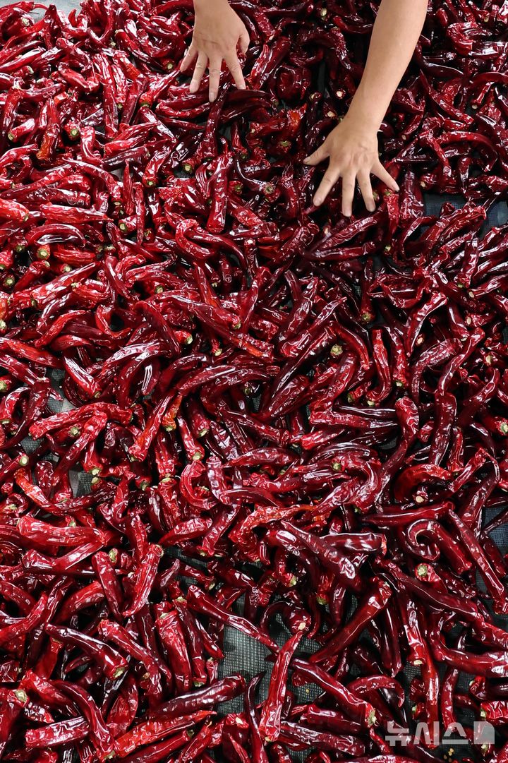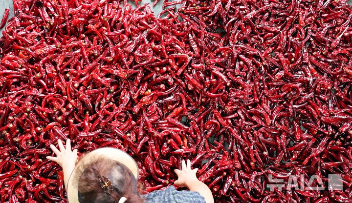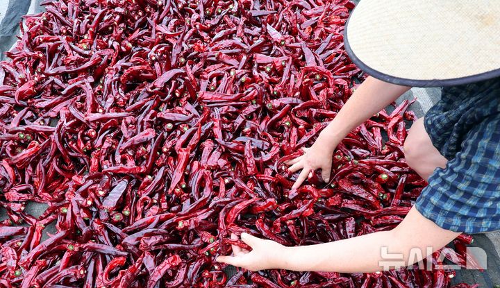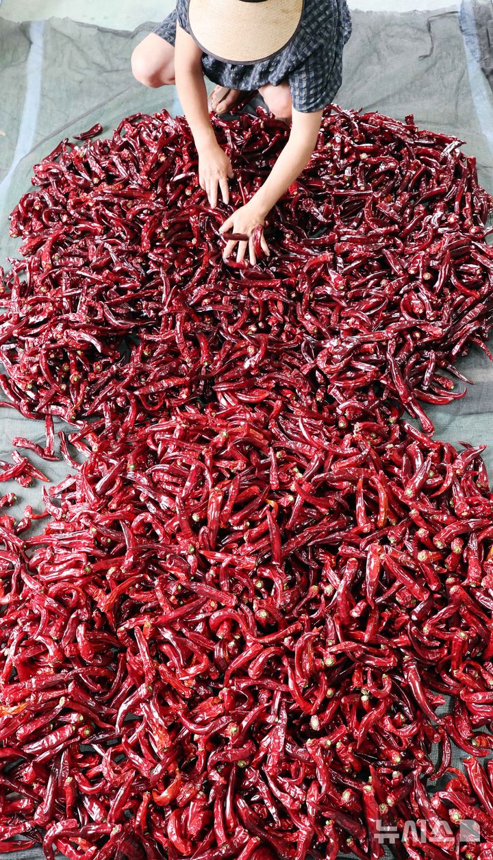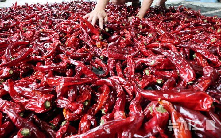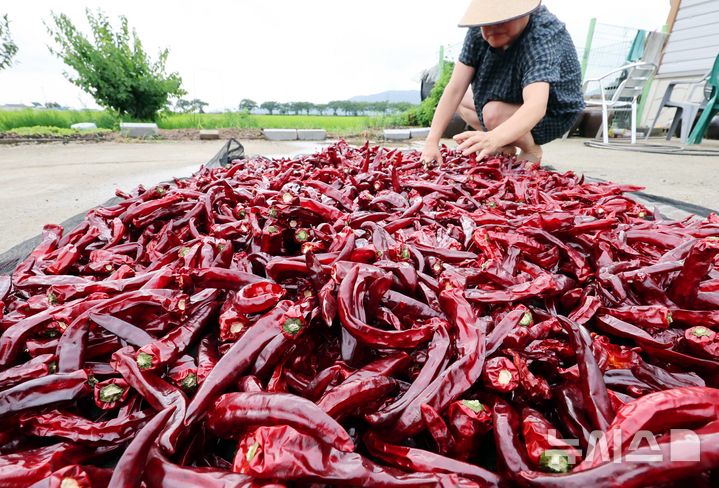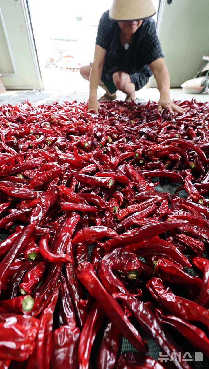 【NEWSIS】二十四節気の一つで秋に差し掛かったことを告げる立秋まであと二日と迫った5日、釜山市江西区のある農家では、トウガラシを広げて干していた。
