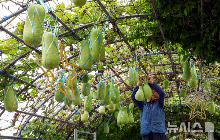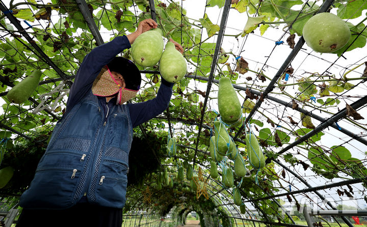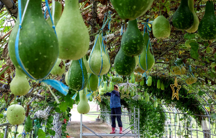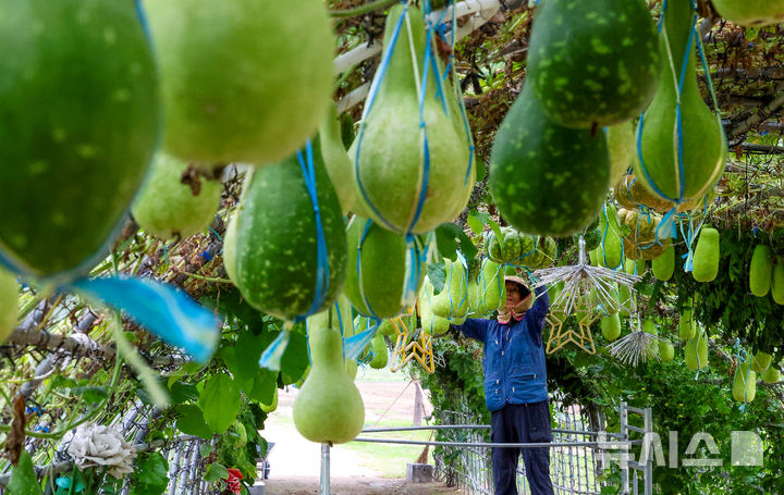 【NEWSIS】二十四節気の一つ、立秋があすに迫った6日、大邱市北区の琴湖江の中州にある「ひょうたんトンネル」で、たわわに実るひょうたんやへちまを施設関係者が縄で固定しているところ。