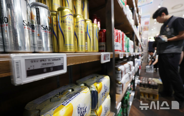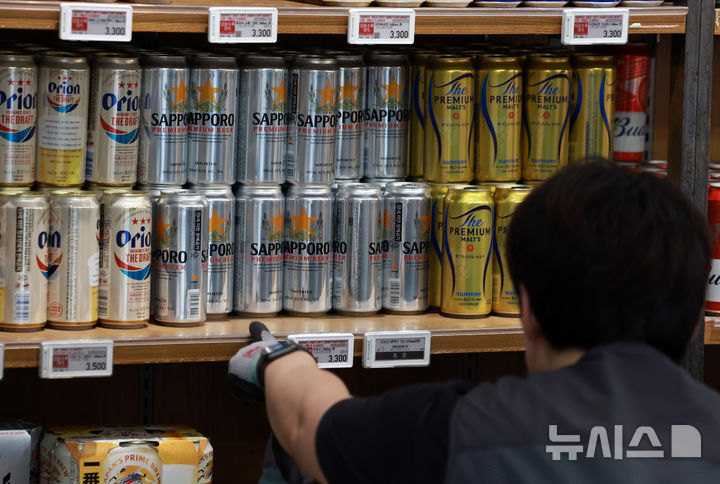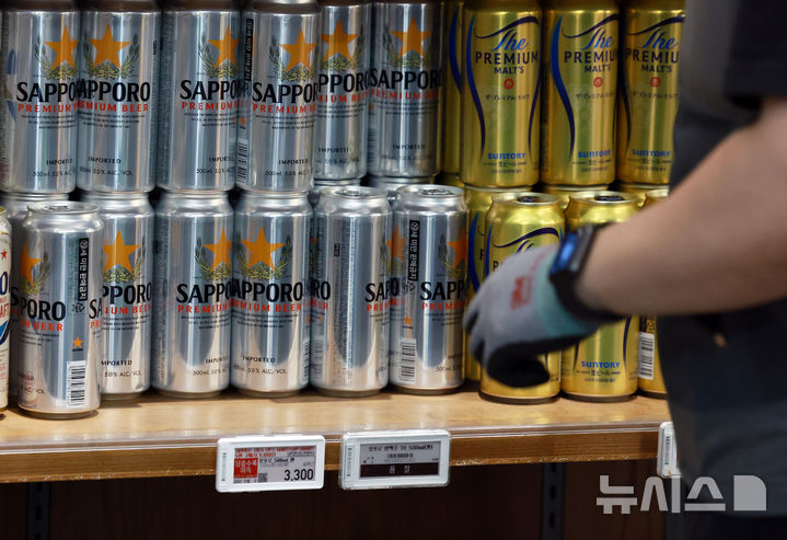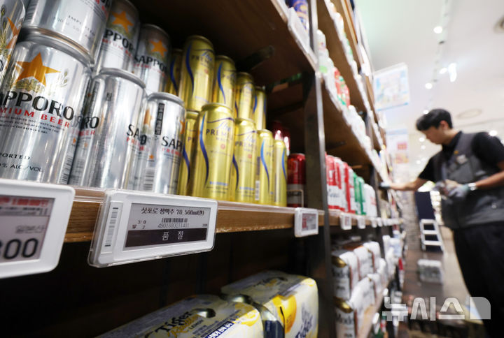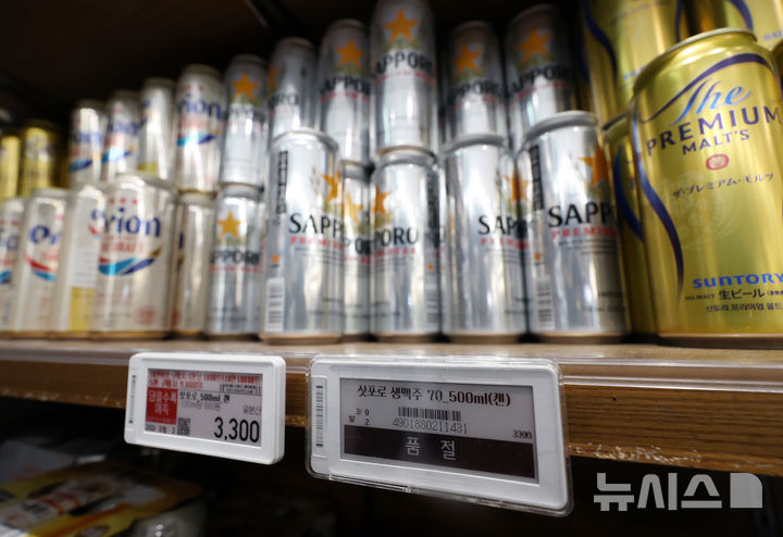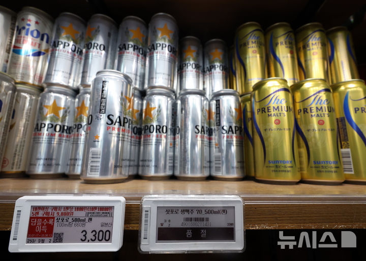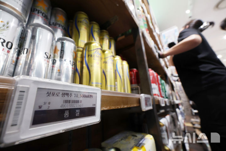 【NEWSIS】「サッポロ生ビール・ナナマル」が品切れを記録した12日、ソウル市内のある大手スーパーに同製品の品切れ案内が掲示されている様子。