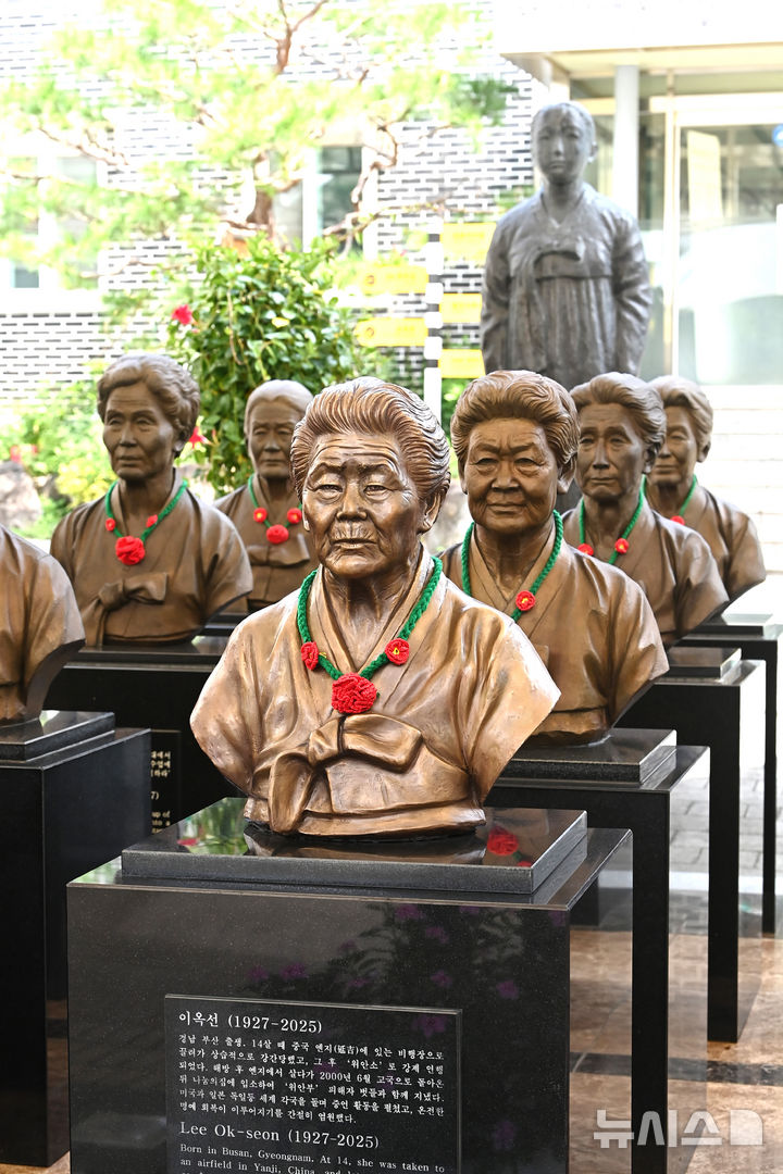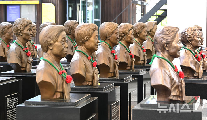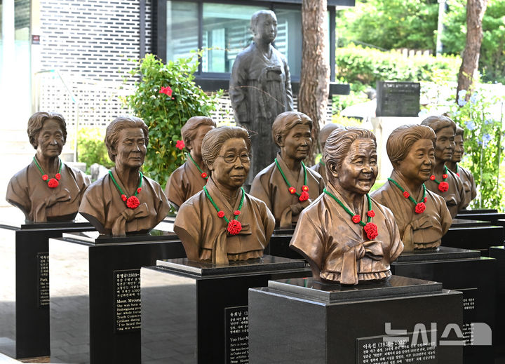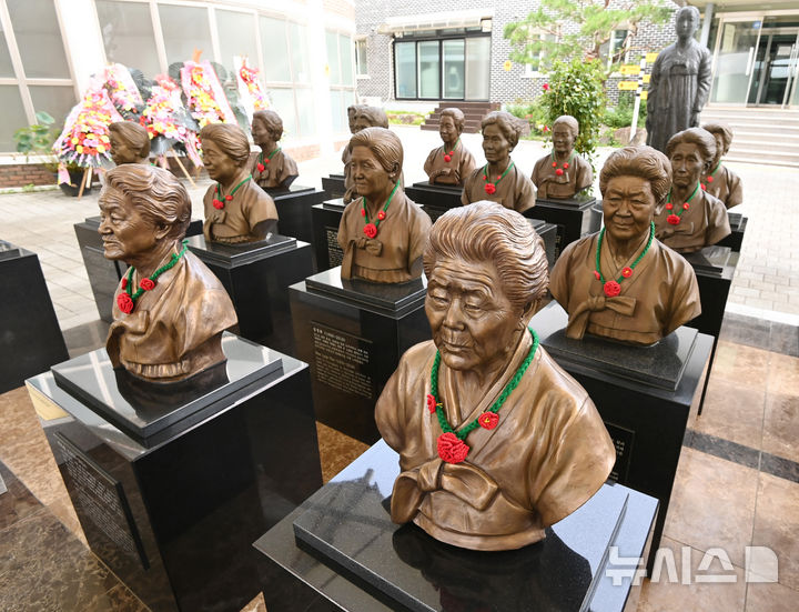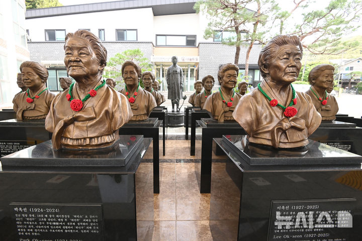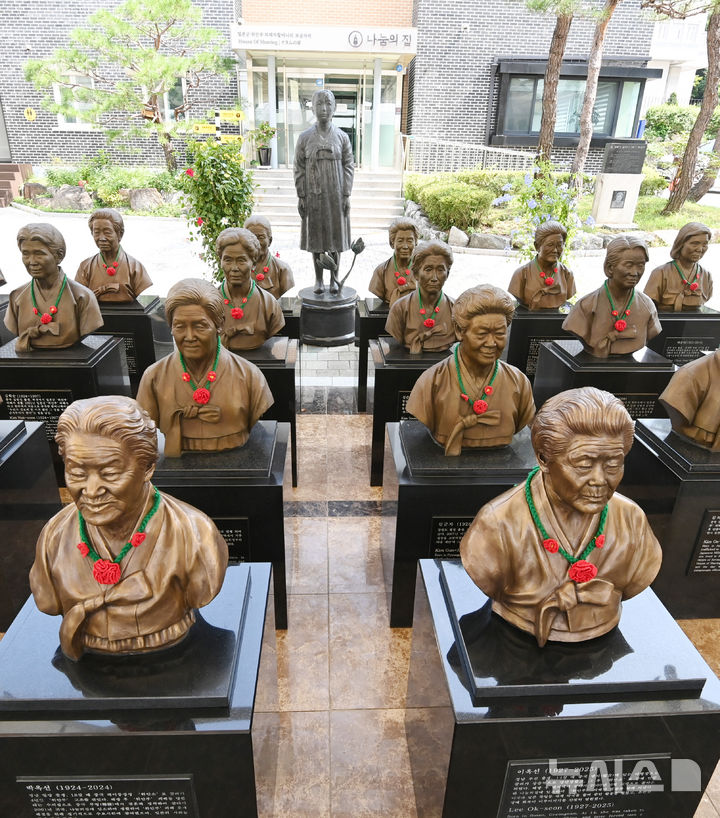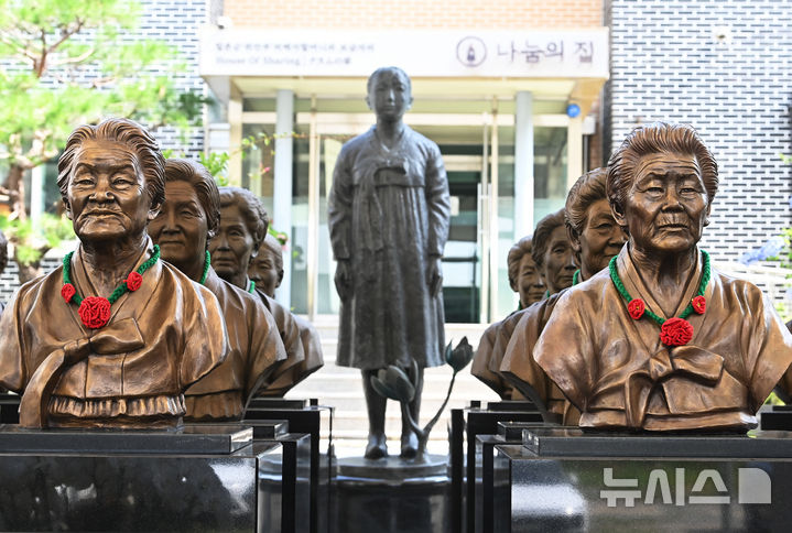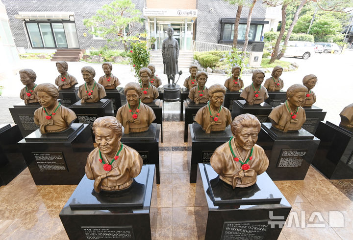 【NEWSIS】21日、京畿道広州市の「ナヌムの家」に立つ、世を去った慰安婦被害者ハルモニたちの胸像。就任後初の日本訪問が迫る李在明(イ・ジェミョン)大統領は、同日報じられた日本メディアとのインタビューで、慰安婦合意および強制徴用解決法は国家間の約束であり、覆すのは望ましくないという意向を明らかにした。