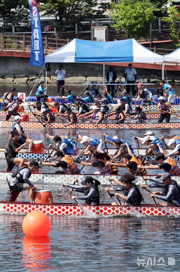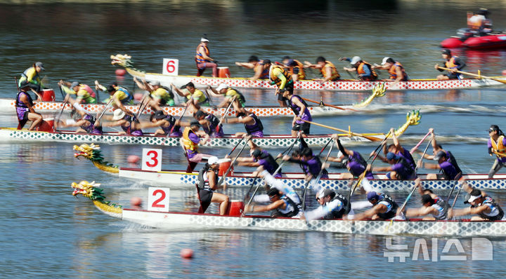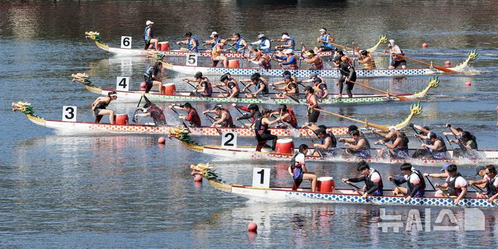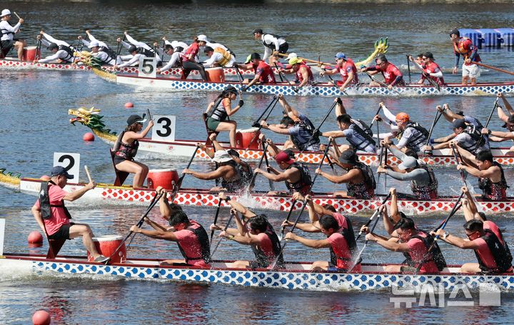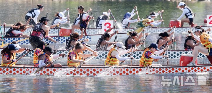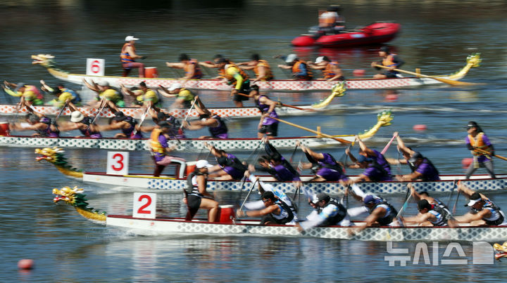 【NEWSIS】「コリアオープン釜山国際ドラゴンボート大会」が開かれた29日、釜山の水営江で、予選に出場する竜船(ドラゴンボート)が疾走している様子。
