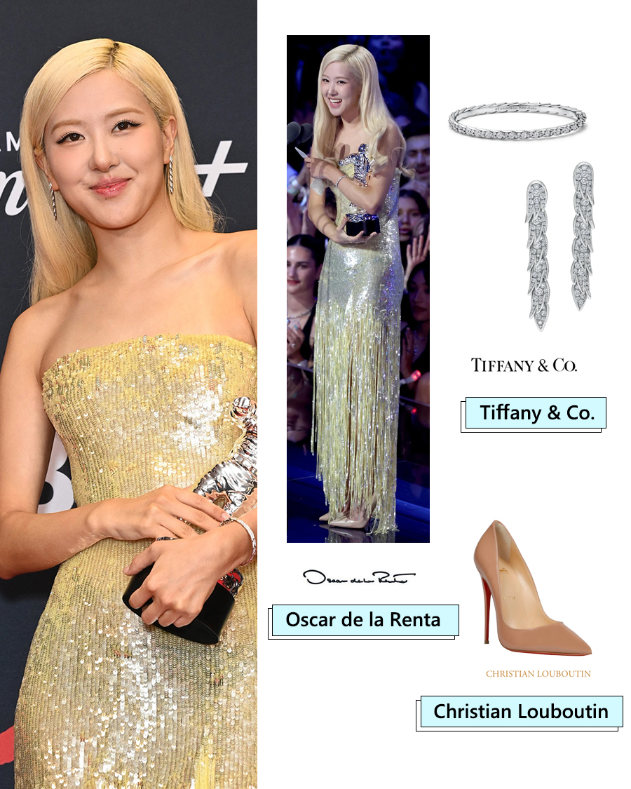 特に、繊細にきらめくフリンジ・デザインがステージの照明と相まって、よりドラマチックなオーラを放っていた。ロゼの洗練されたスタイリングは授賞式の華やかな雰囲気を一段と引き立て、グローバルスターとしての存在感をあらためて証明した。