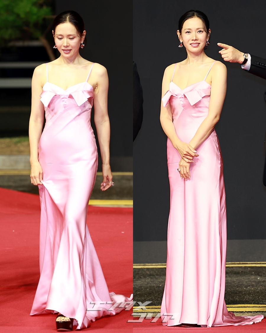 この日ソン・イェジンが選んだドレスは、かすかに輝くサテン素材がソン・イェジンの上品なシルエットをさらに引き立て、スリムなフィット感と大きなリボンでロマンティックなムードを漂わせている。