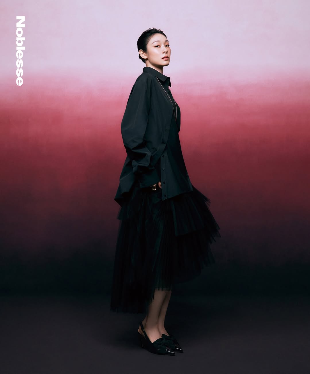 また別のショットでは、黒のシャツブラウスにスカートを合わせ、優雅だがインパクトの強いシルエットを見せている。シンプルな黒のパンプスとジュエリー使いからもカリスマ性が感じられる。