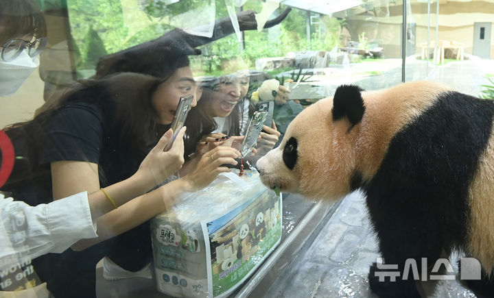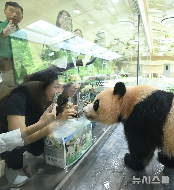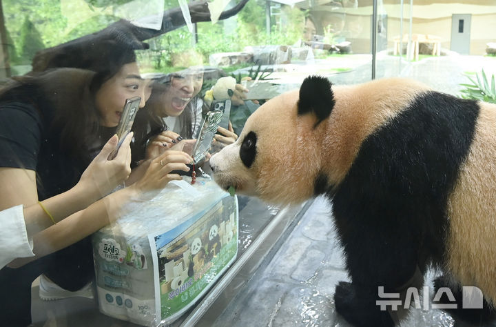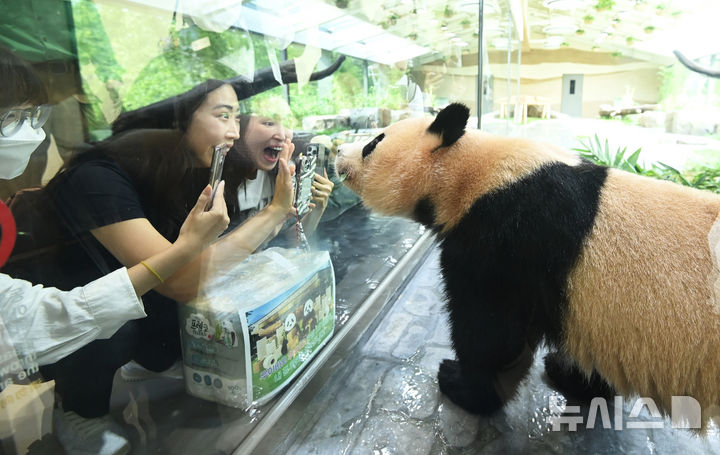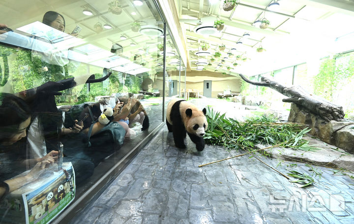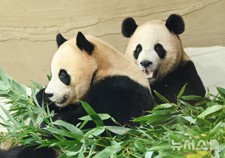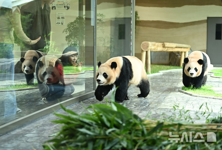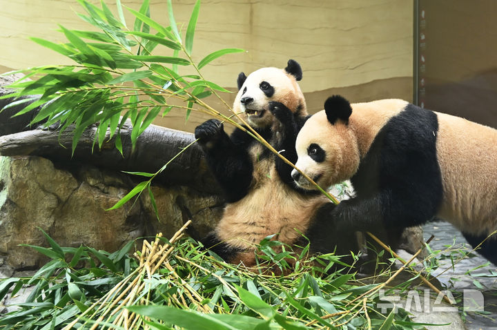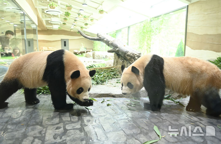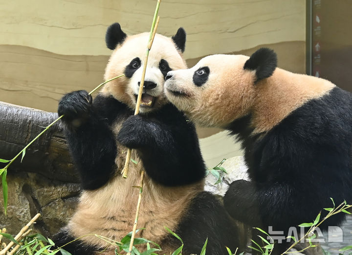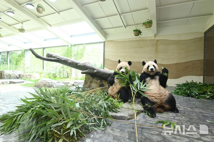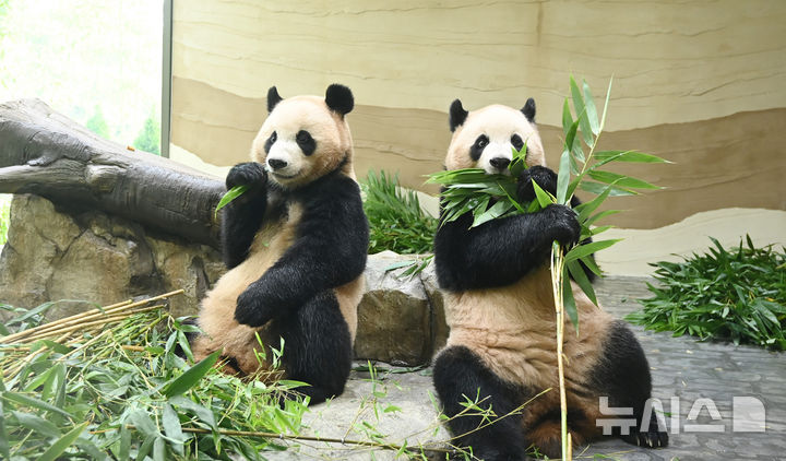 【NEWSIS】韓国国内で生まれた初めての双子パンダ「睿宝」と「輝宝」が2日、エバーランド(京畿道竜仁市)内の新たな飼育場たる「パンダ・セカンドハウス」でえさを食べているところ。パンダ・セカンドハウスは、パンダワールドのすぐ隣の敷地(広さおよそ1200平方メートル)に室内・室外の放し飼い場と内室などを備えた、子どもパンダ専用の空間として造成された。エバーランドは、秋夕(中秋節。今年は10月6日)の連休が始まる今月3日にパンダ・セカンドハウスを一般に公開する。
