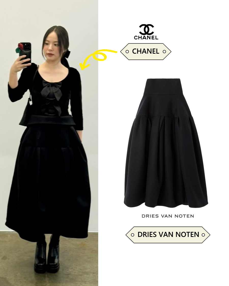 この日ミン・ヒョリンが着ていたトップスはCHANEL(シャネル)の2025年秋冬シーズンのアイテム。スカートはDRIES VAN NOTEN(ドリス・ヴァン・ノッテン)のアイテムで、およそ260万ウォン(約27万4350円)だという。
