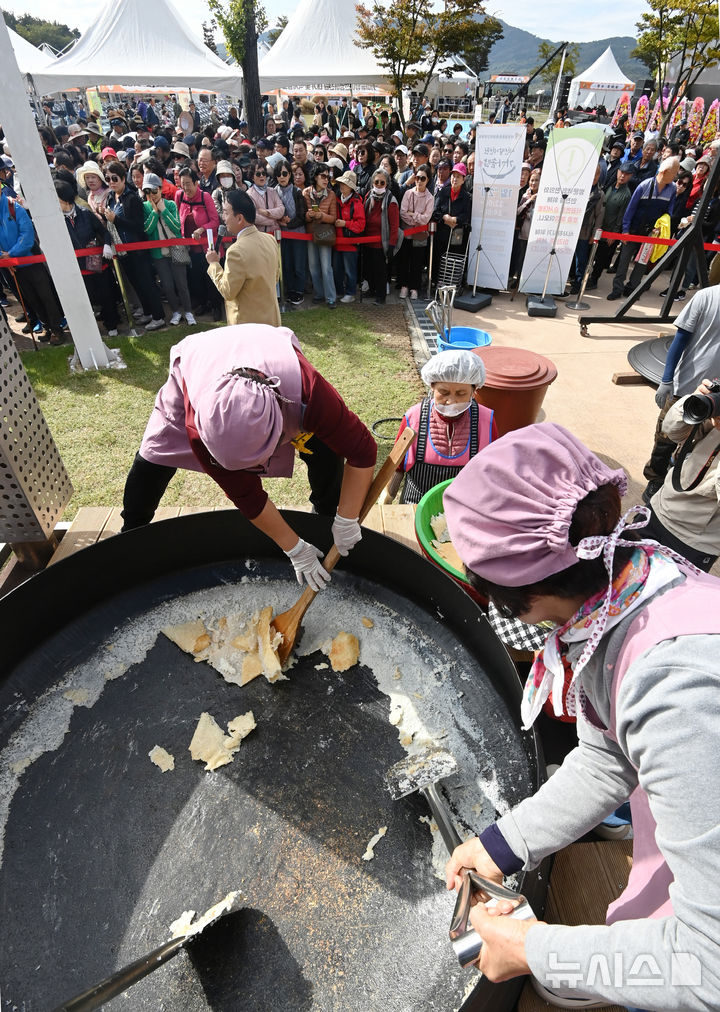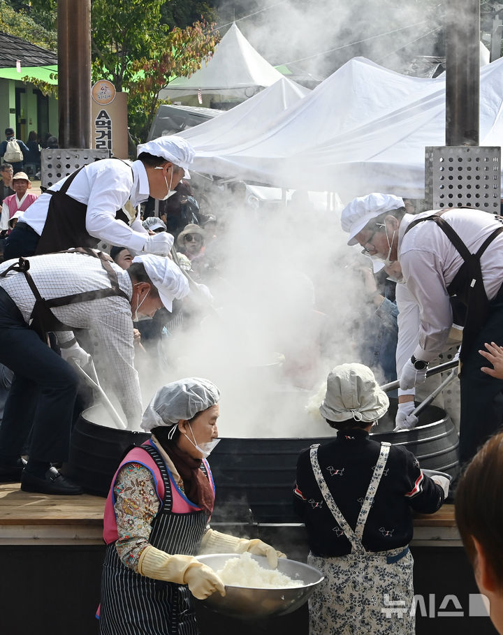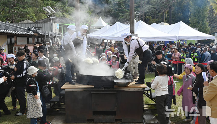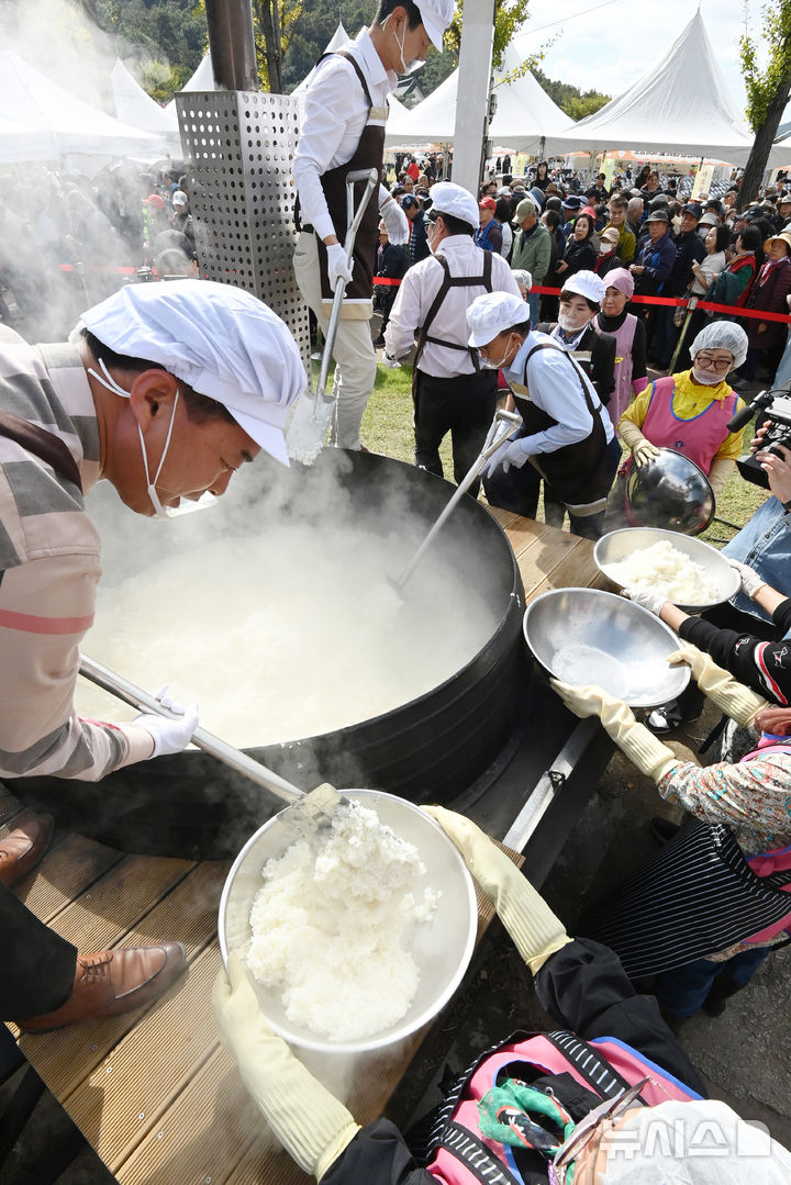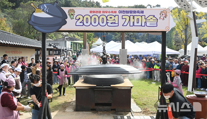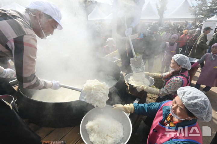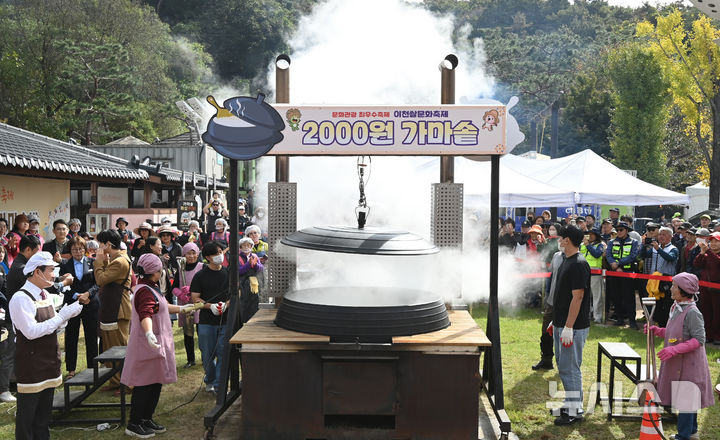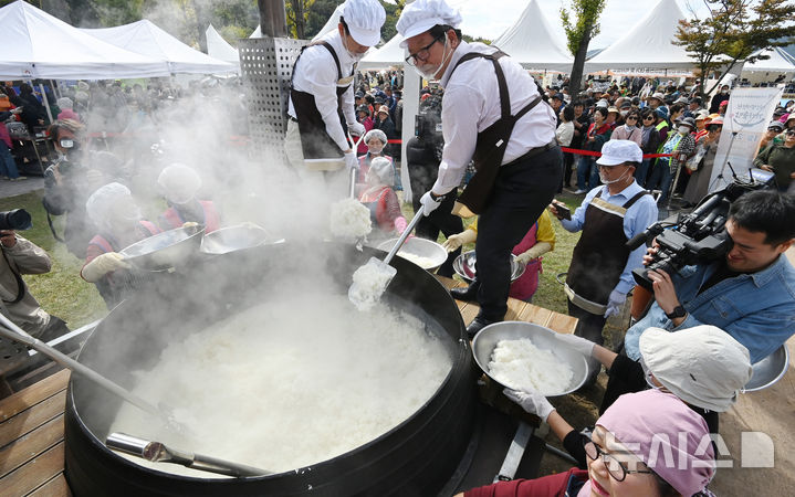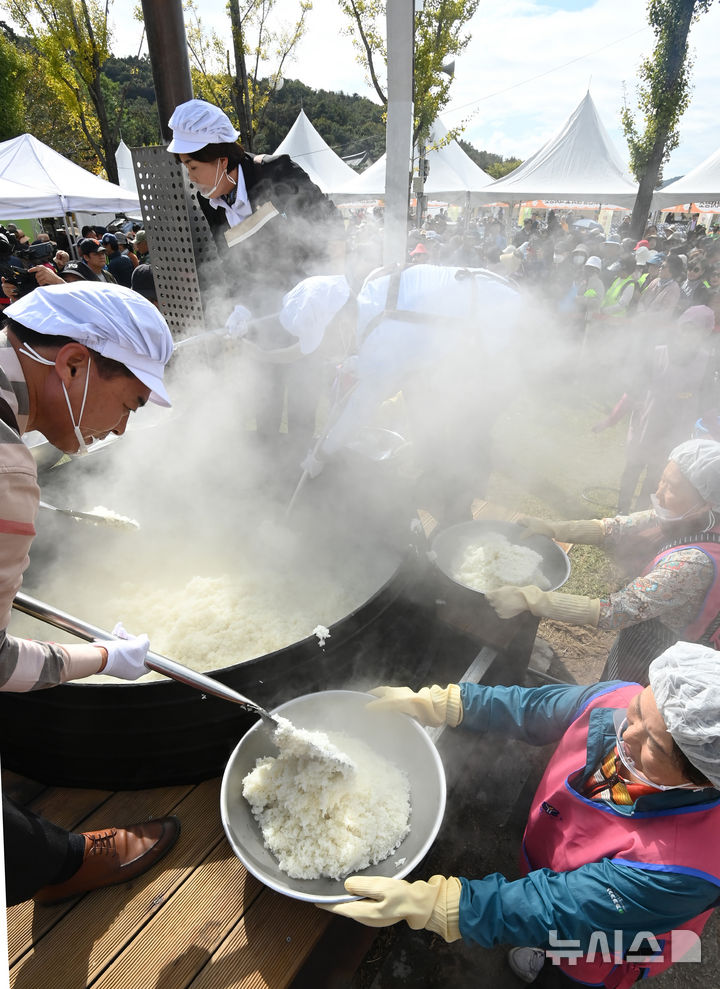 【NEWSIS】第24回利川コメ文化祭が開かれた22日、京畿道利川市暮加面の利川農業テーマ公園で、超大型の釜を使った2000人分の米飯炊きが行われている様子。