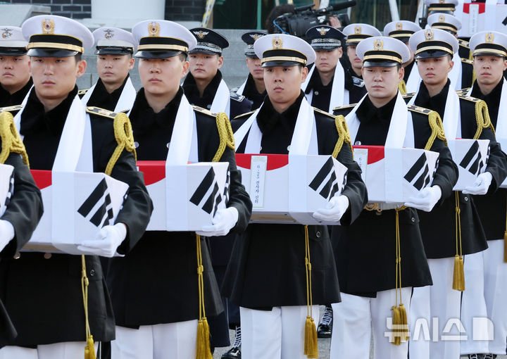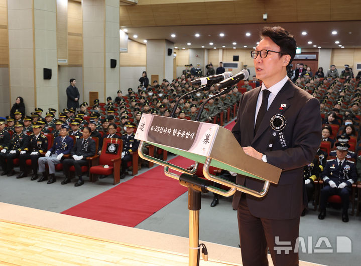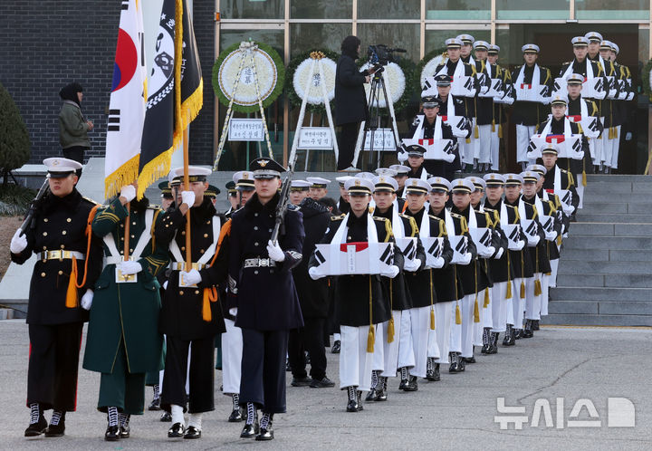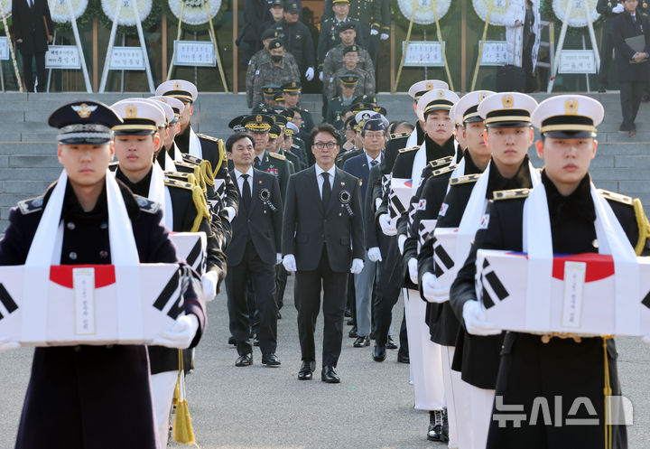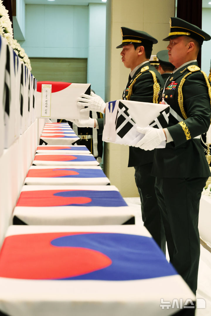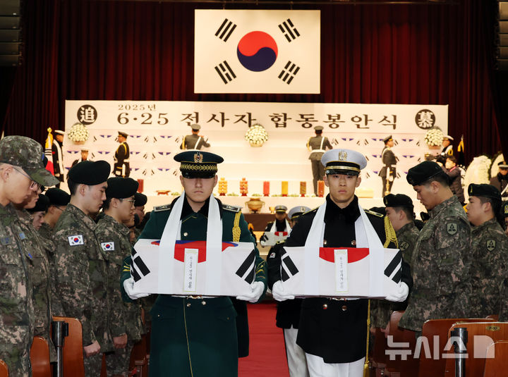 【NEWSIS】15日午前、ソウル市銅雀区の国立ソウル顕忠院で開かれた「2025年6・25戦死者合同奉安式典」で、戦死者の位牌を奉送する国軍兵士。